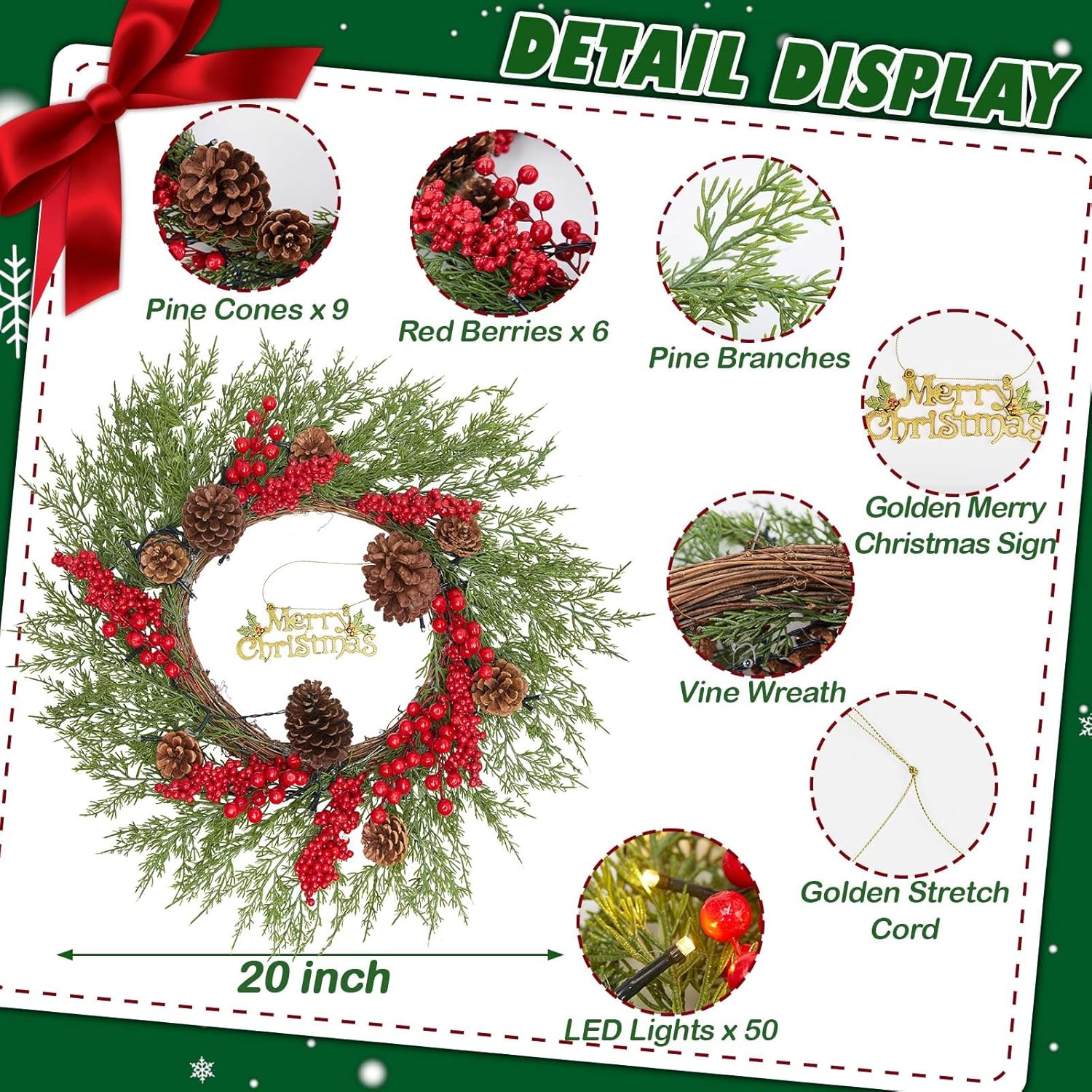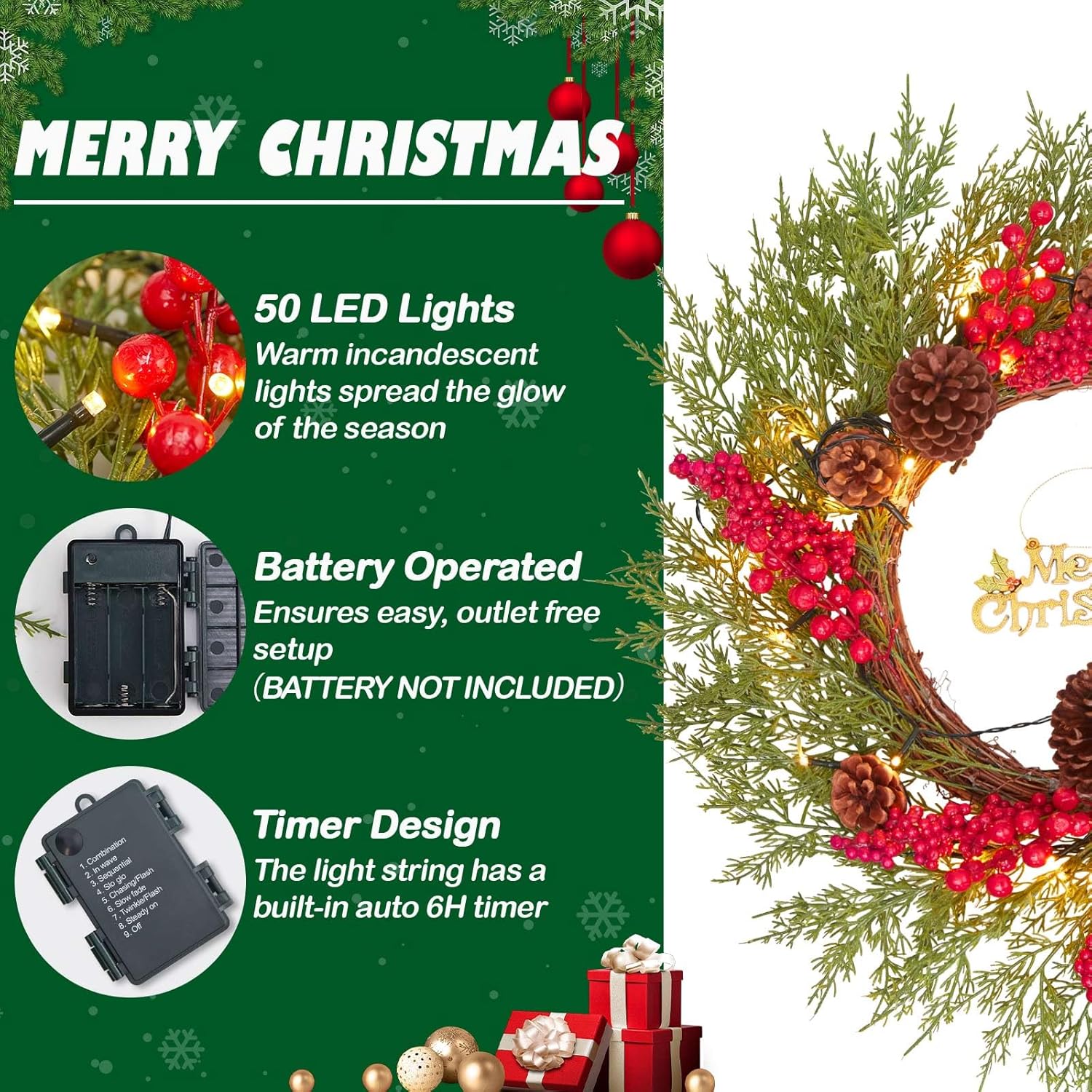 20 Inch Christmas Wreath with 50 Lights Timer (Battery Not Included) Small Christmas Wreaths for Front Door with Pine Cones Berries Christmas Door Wreath Winter Indoor Outdoor Wall Decoration