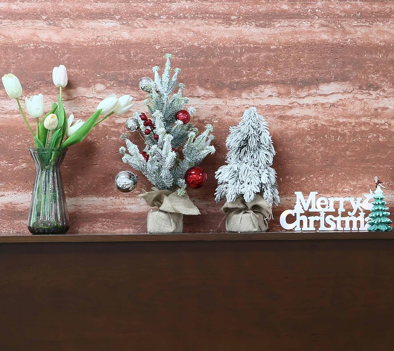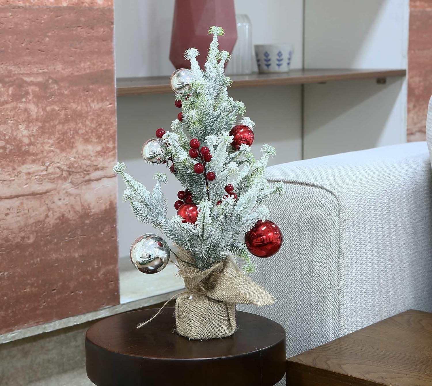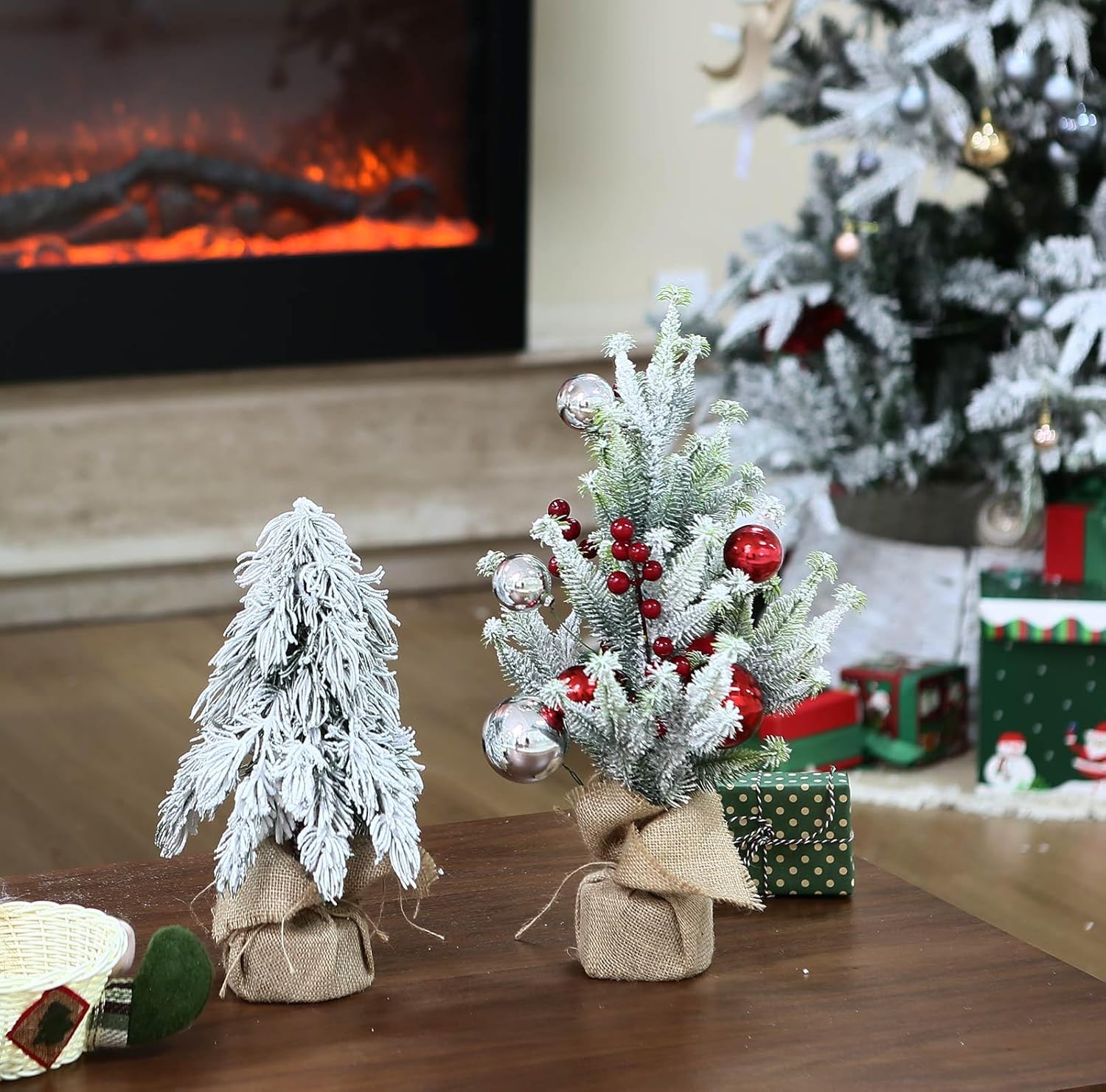 20 Inch Tabletop Christmas Mini Tree, Artificial Snow Flocked Small Christmas Pine Tree with Silver Red Christmas Balls Burlap Base for Home Table Desk Dining Bedroom Christmas Party Decorations