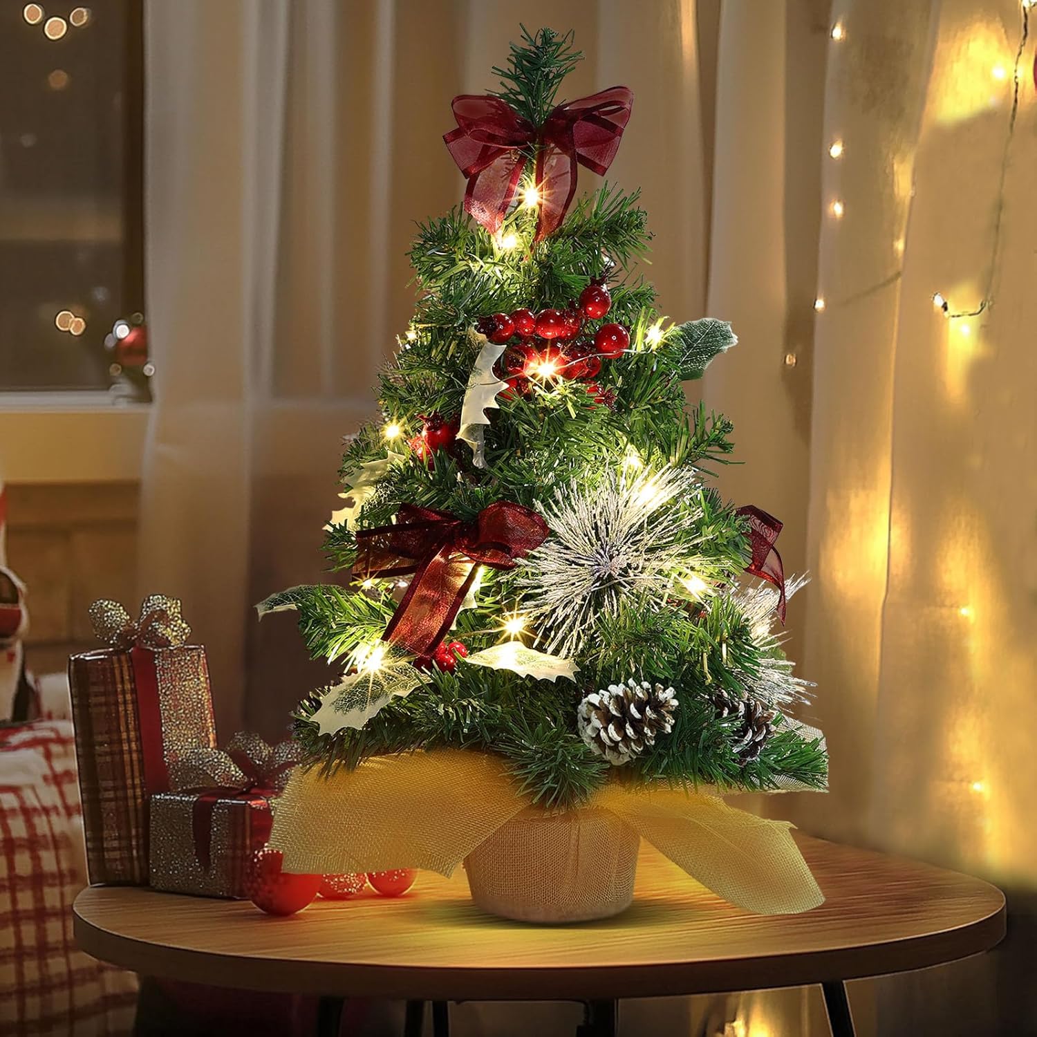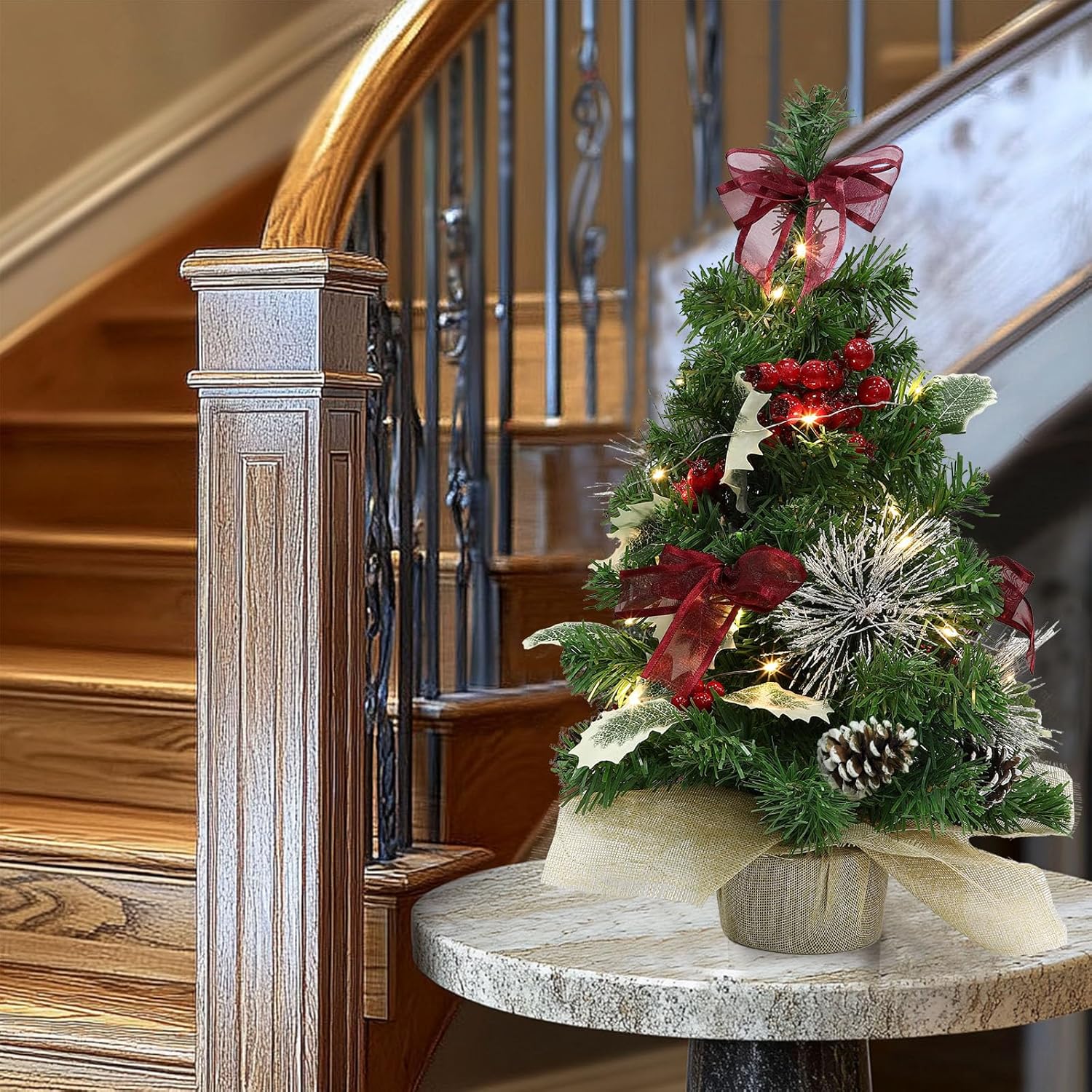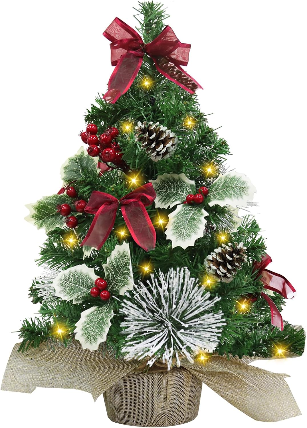 20 Inch Tabletop Mini Christmas Tree with Lights & Timer 20 LEDs Holly Leafed Berried Red Bows Decorated Artificial Small Christmas Tree with Lights Christmas Decorations for Xmas Home Decor