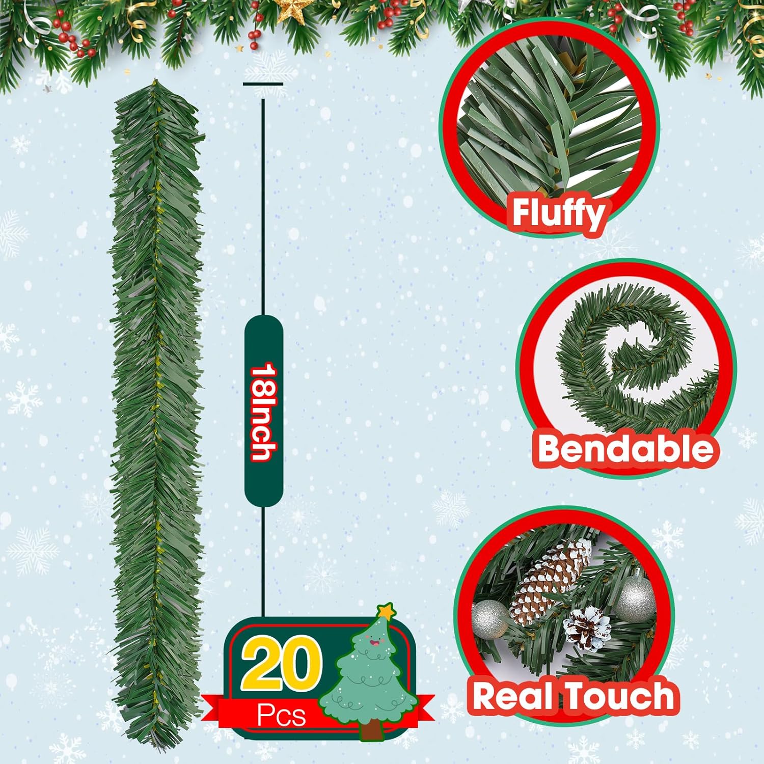 20 Pcs Christmas Garland Ties 18 Inch Artificial Pine Needles Faux Pine Green Twist Ties for Banister, Christmas Tree Branches for Xmas Holiday Decoration Craft Wrapping