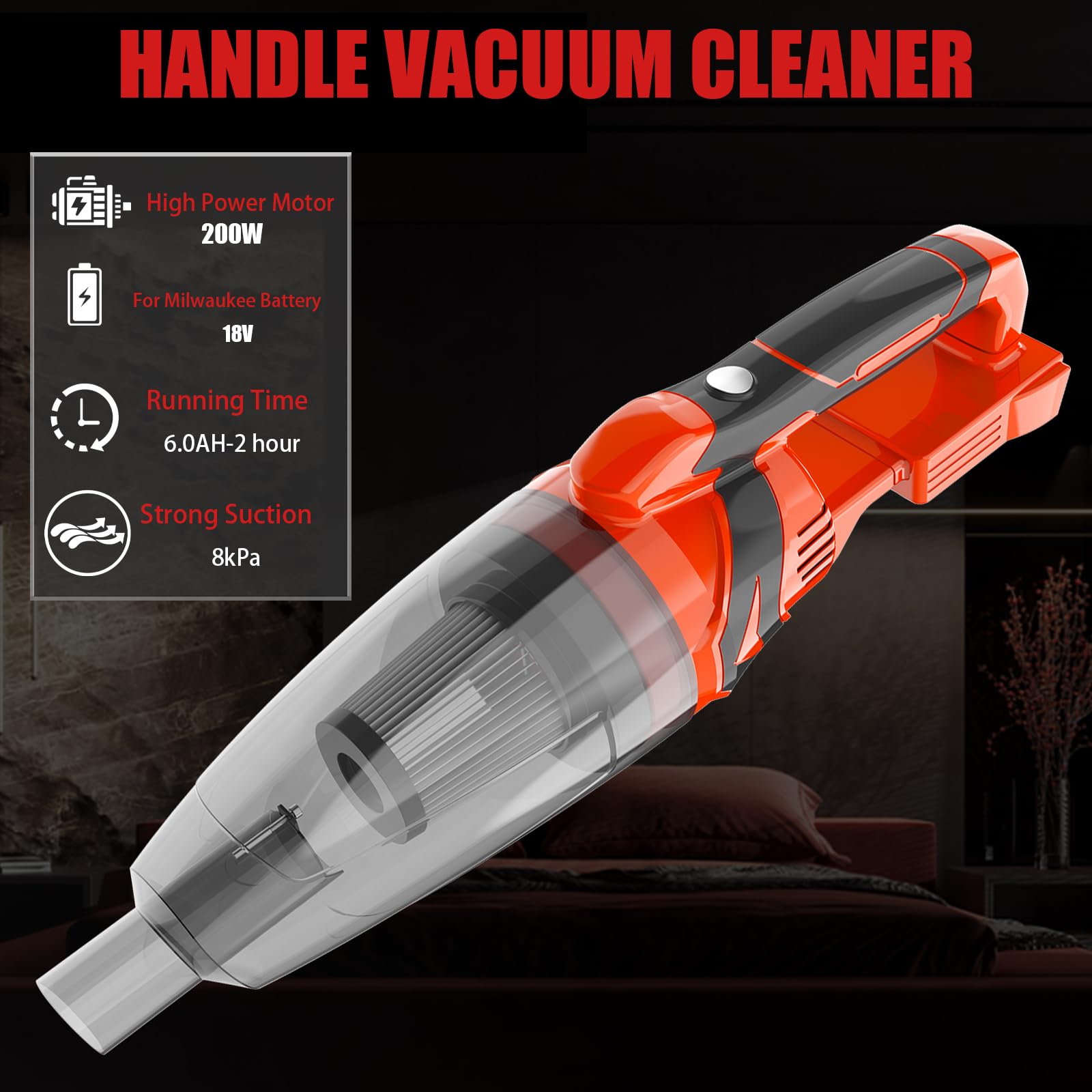 For milwaukee batteries Match for milwaukee 18V Max lithiumion batteries. Washable HEPA filter the package includes two highquality Hepa Filters that are easy to maintain, install, and are washable and reusable multiscenario It effortlessly tackles hair, dirt, and debris on various surfaces like carpets, car interiors, and furniture Introducing the Nubrom 200W Handheld Vacuum Cordless your ultimate cleaning companion, designed for versatility and convenience, this lightweight handheld vacuum boasts an impressive 8kPa strong suction, making it the ideal choice for tackling a variety of cleaning tasks. Specifications: Model: Vacuum Cleaner for Milwaukee Battery Voltage: 18V Container volume: 600ml Air Power: 200W Working current: 6.3A Noise Level: 65dB Item Weight: 3.45 pounds Package Dimensions: 11.69 x 7.36 x 6.93 inches Suitable for MILWAUKEE 18V MAX Slider Package includes: 1 x Main Machine,2 x Heap Filter, 2 x Wide Mouth Nozzle, 1 x Crevice Nozzle, 1 x Brush Nozzle, 2 x Extension Tube,1 x User Manual Q: Will this work well for cleaning dust in the car's interior A: The handheld vacuum cleaner is specifically designed for cleaning interior dust, boasting a powerful 8kPa suction that ensures thorough and effective cleaning. Q: What battery is suitable for A: Our cordless handheld vacuum fits for Milwaukee 18V battery, but the package not included battery, you need to buy it separately. Q: Is it easy to clean filter A: Yes, the Hepa filter of the handheld vacuum is easy to detach and clean. Q: How long does it work on full charge A: The vacuum cleaner has a continus use time of up to 30 minutes,but we recommend you stop for a few minutes after using it for 1012 minutes so as to protect the motor. Q: Can it be used to suck up pet hair A: Yes, it can, Our handheld vacuum is equipped with different nozzles to meet different use scenarios