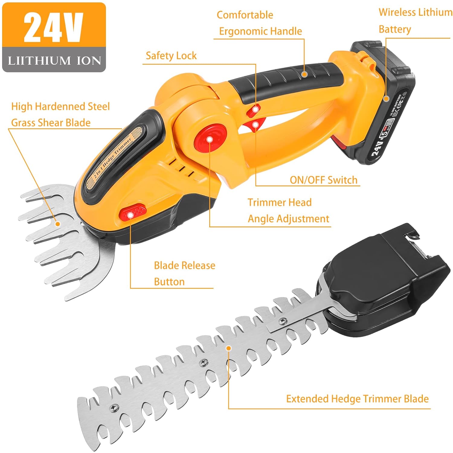 24V Cordless Grass Shear & Hedge Trimmer, 2 in 1 Electric Mini Hedge Trimmer, Handheld Grass Cutter Clippers Power Hedge Trimmers with 1500mAh Rechargeable Battery & Charger for Gardening