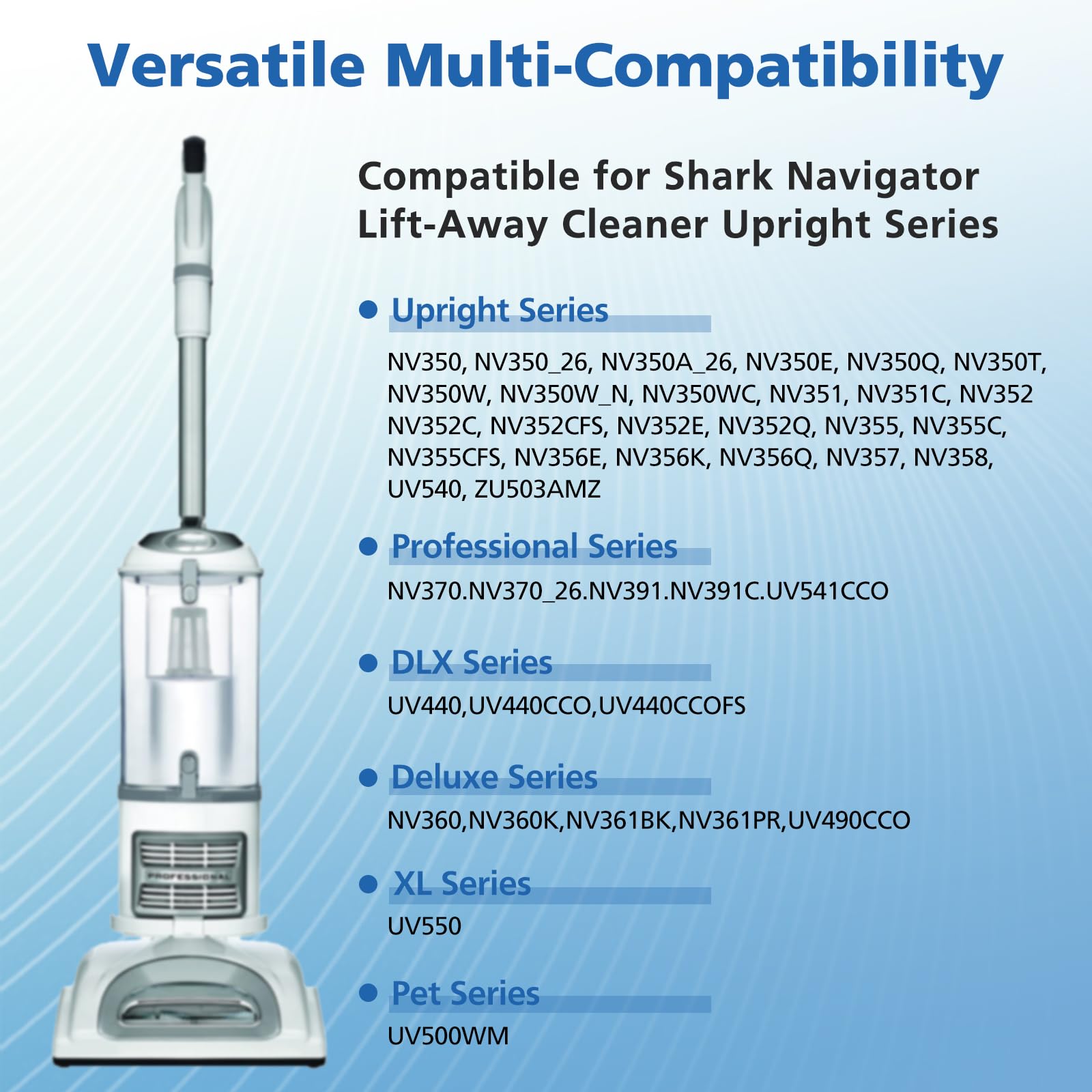 • Perfect Compatible with Shark Navigator Lift Away Models: CU510, NV35026, NV350A26, NV350E, NV350Q, NV350T, NV350W, NV350WN, NV350WC, NV351, NV351C, NV351WM1, NV351WM2, NV352, NV352C, NV352CFS, NV352E, NV352Q, NV354C, NV355, NV35526, NV355C, NV355CFS, nv356E, NV356K, NV356Q, NV357, NV358, NV358BRN, NV360, NV367, NV360K, NV361BK, NV361PR, NV370, NV37026, NV380, NV391, NV391C, UV440, UV440CCO, UV440CCOFS, UV490CCO, UV500WM, UV540, UV540CCO, UV541CCO, UV550, ZU503AMZ, CU500CU512 series, Compare to Part Xff350 & Xhf350.
