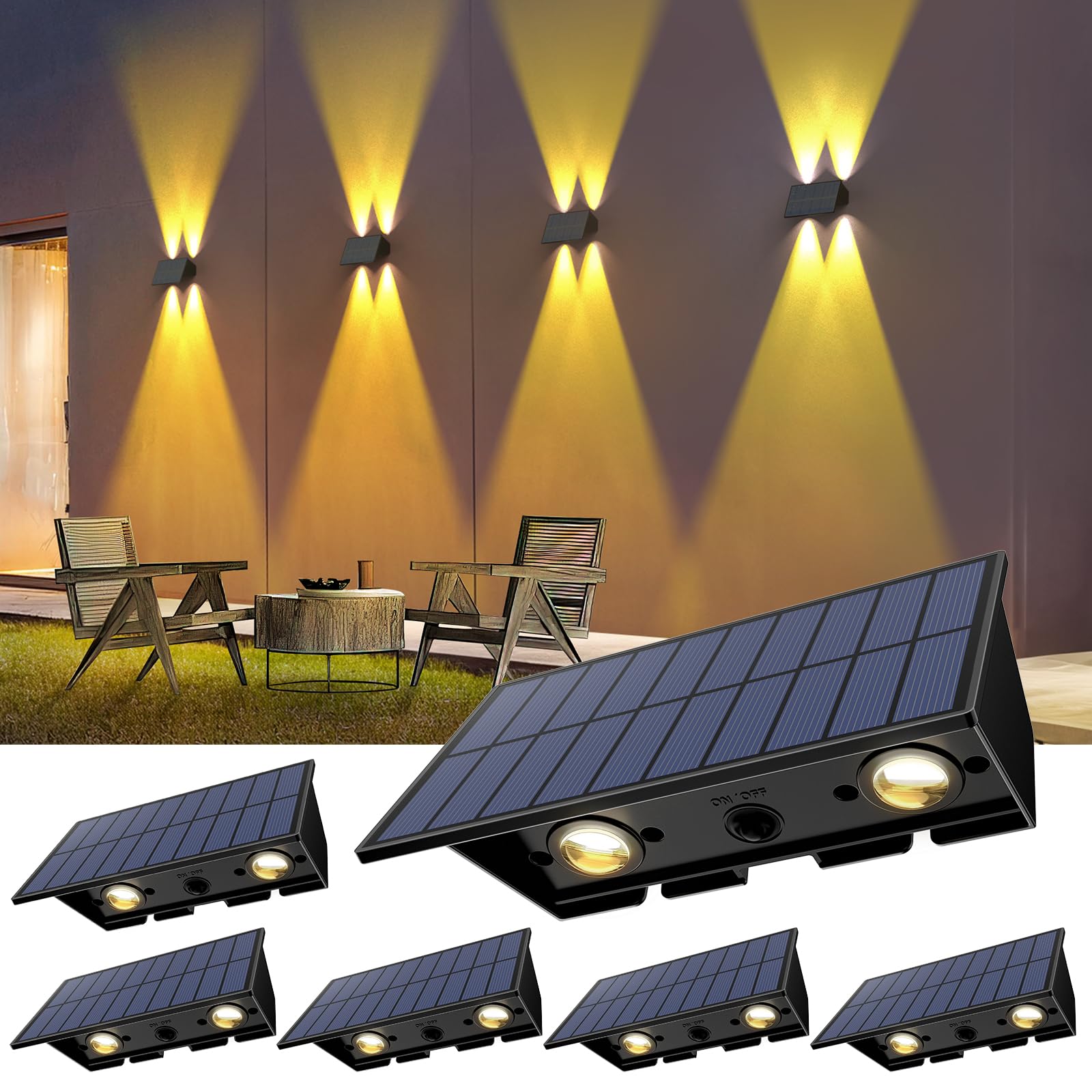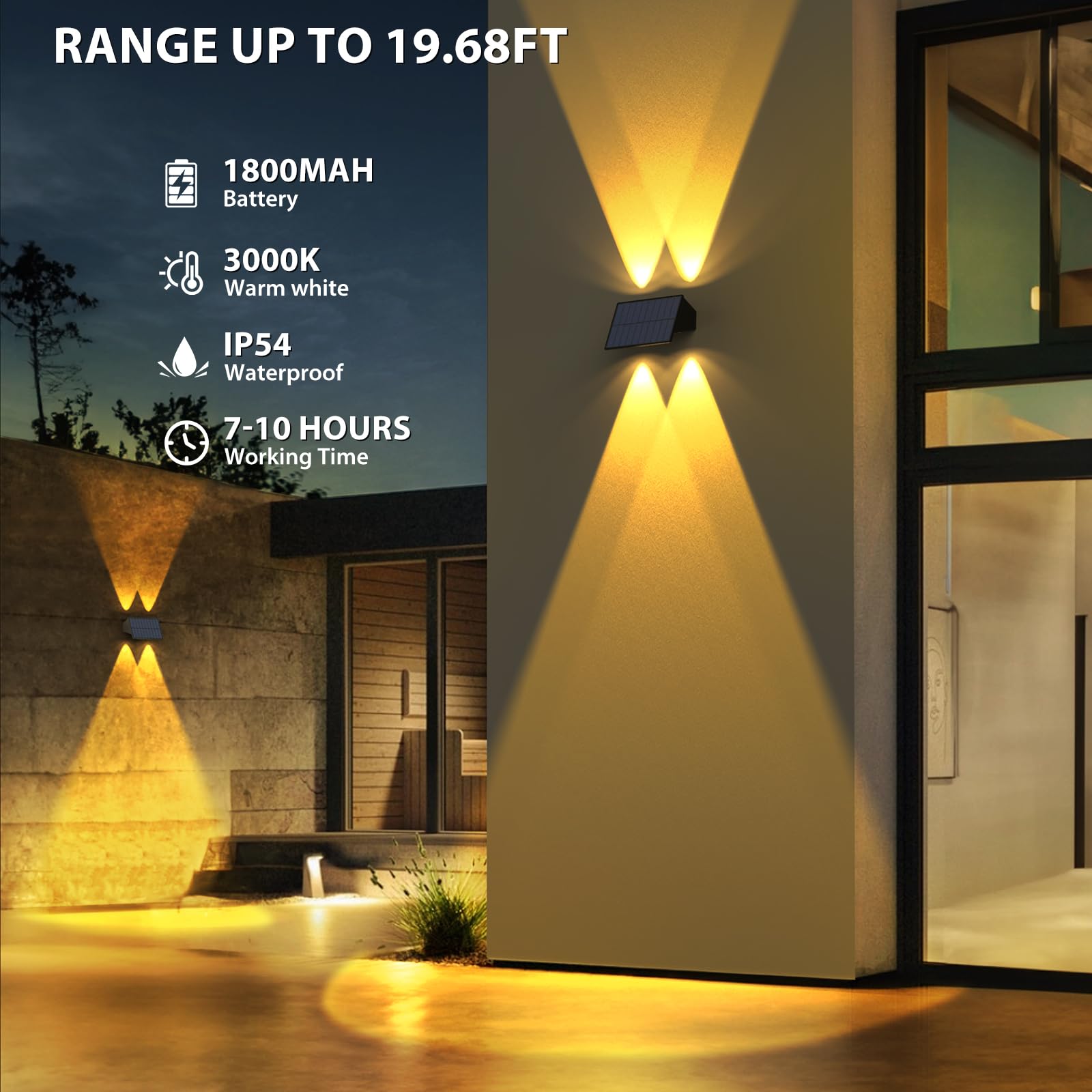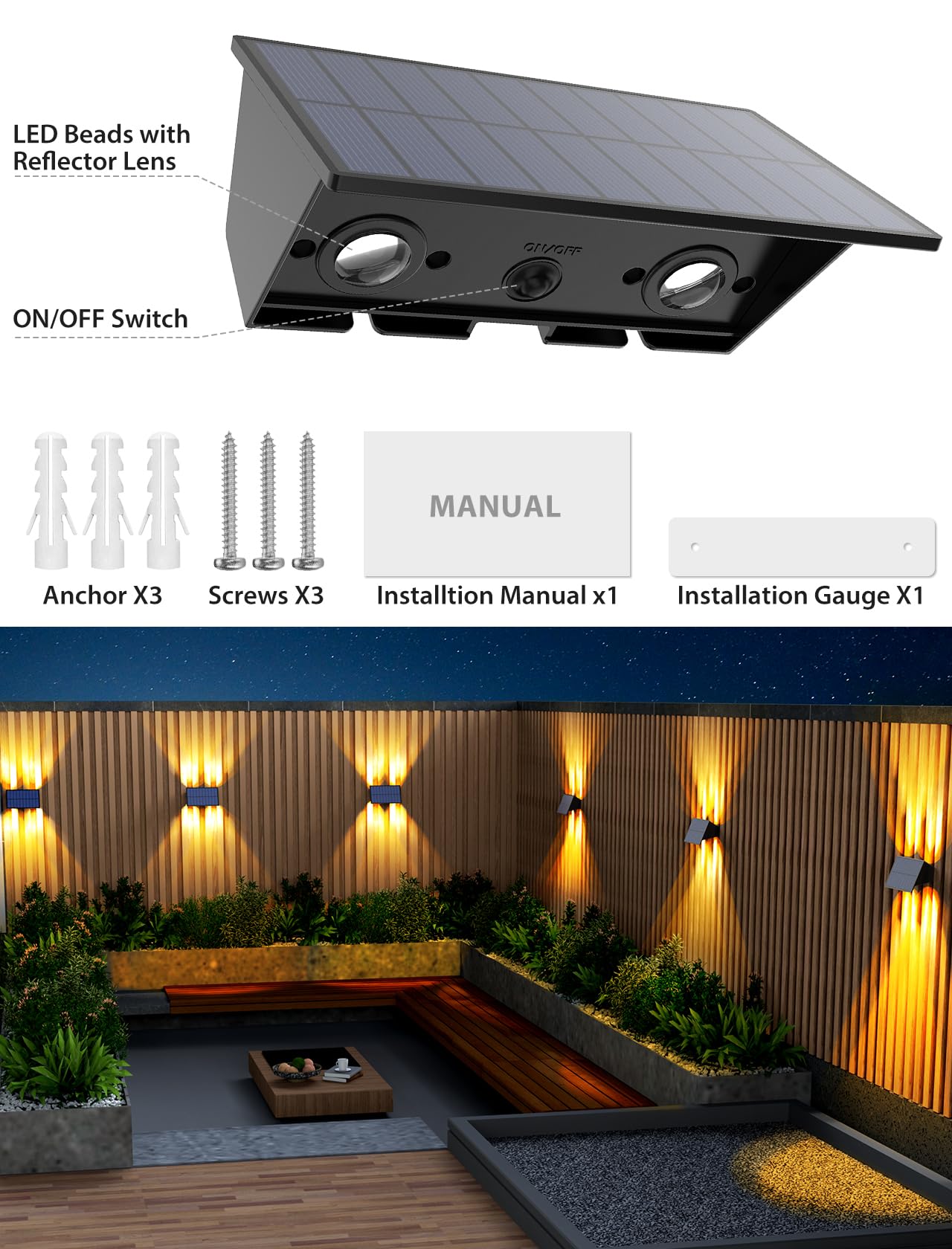 【Christmas Solar Wall Lights】: Solar Wall lights outdoor make your house brighter than before. Press the ONOFF switch to cycle through light settings to choose your favorite one:down light ,up and down light.The two lighting methods can be more suitable for various occasion. The downward mode can be used on guardrails or stairs, and the up-down mode can be used on open and high courtyard walls. The d Up and Down outdoor solar lights feature high light intensity up to 19.68Ft, making them ideal for Halloween exterior decoration and lighting. 【Super Brigh & d Lens LED 】:Each solar wall light comes with 4 LEDs that are amplified by convex lenses to concentrate the light distribution. With 100 Lumens up and down bright light from each solar wall light, you are able to see wider areas more clearly at night.Concentrating lens design to make the light brighter, which means you only need fewer solar lights to create the same or better lighting effect than other lights in the same area.