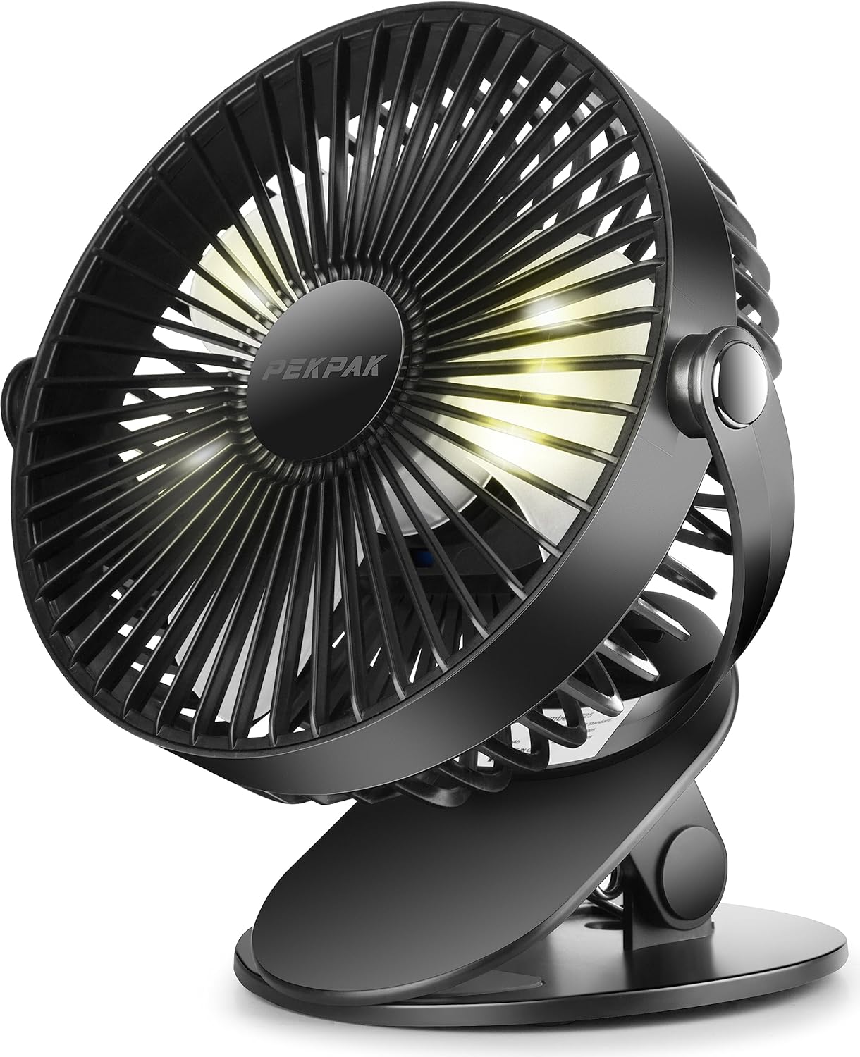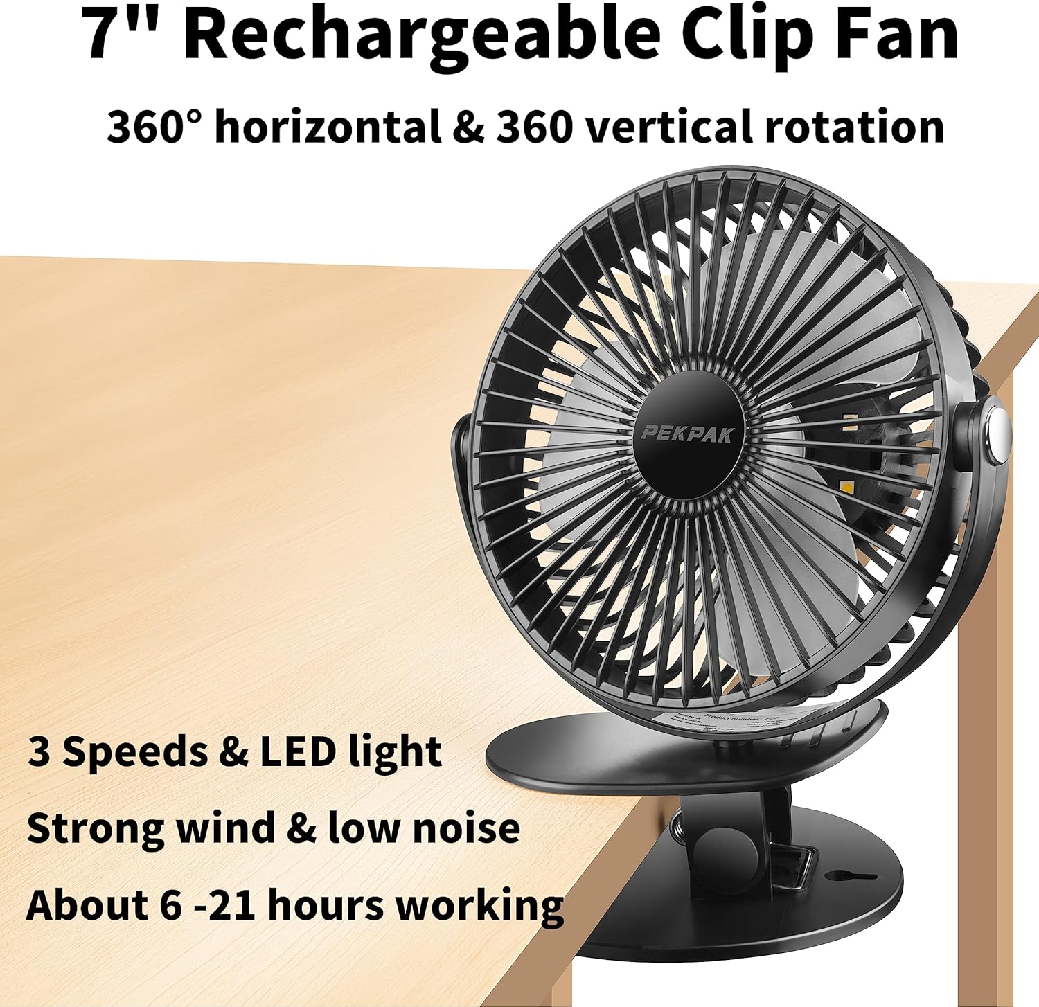 • LED Light 3 Speed Wind] PEKPAK 7 rechargeable clip fan has two kinds of light brightness, you can use it as a small night light. Three gears to adjust the wind speed, easy to operate, as you like to control the wind speed size to meet different needs.