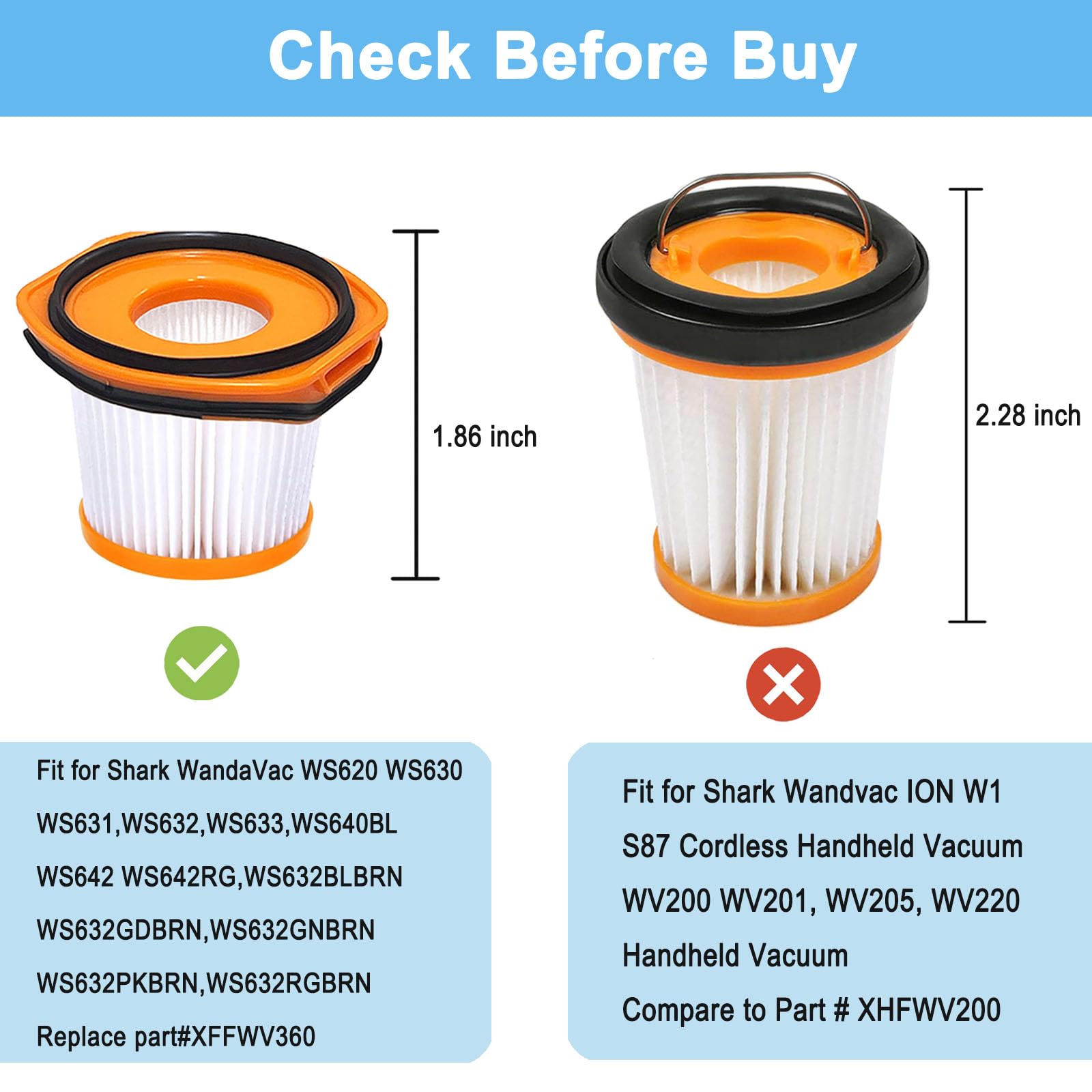 ✅Compatibility: Compatible with Shark WandaVac System UltraLightweight Powerful Cordless Stick Vacuum WS620,WS630,WS631,WS632,WS633,WS640BL,WS642,WS642RG,WS632BLBRN,WS632GDBRN,WS632GNBRN,WS632PKBRN,WS632RGBRN,Replace partXFFWV360. ❌Please NOT Compatible with Shark Wandvac WS640AE & WS642AE with SelfEmpty System. ☕Warm Tips: To keep your Handheld Vacuum running at peak performance, it would be better to change these filters every 23 months depending on your use frequency. 🎁 Package Include:8 pack Vacuum Filters 1 Cleaning Tools📢 Any use of the shark brand name or model designation for this product is made solely for purposes of demonstrating compatibility.