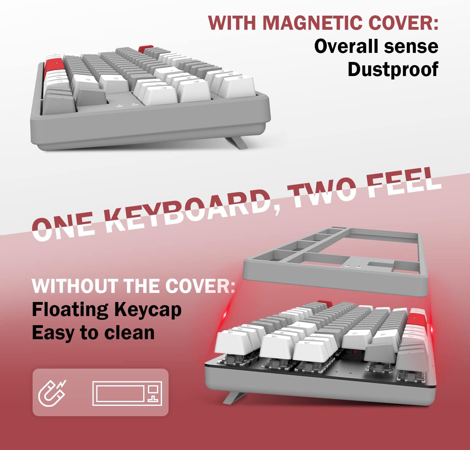 • 【Hot Swapped Red Switch】This wired mechanical gaming keyboard was designed with hotswapped PCB and preinstalled 2 kinds of mechanical switchLinear Red switch under the 82 small keys and linear white switch under 5 large keys(LeftRight Shift, Space Bar, Enter, Backspace for offering different typing feel, can compatible with most 3pin and 5pin switch in the market like Cherry MX, Gateron, Kailh, Akko, Glorious,etc.