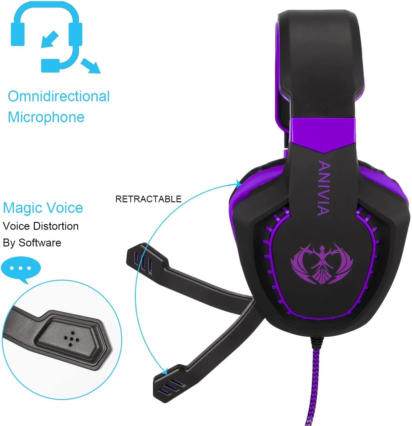Anivia Computer Over Ear Headphones Wired with Mic Stereo Gaming Headset Noise Isolating Headsets with Volume Control, Bass Surround, Soft Memory Earmuffs for Multi-Platform -AH28plus Black Purple