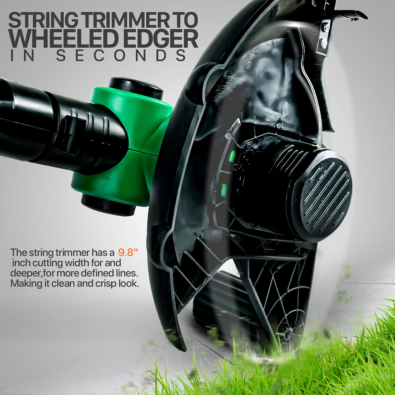 • PERFORMANCE SPECS - This 2-In-1 Brush Motor system easily converts from Trimmer to Edger in seconds, while providing a cutting width of 9.8-10.2" inches, a no load run time of 55 minute, The Guard Wheel supports and guides the edger, giving you straighter lines and cleaner cuts