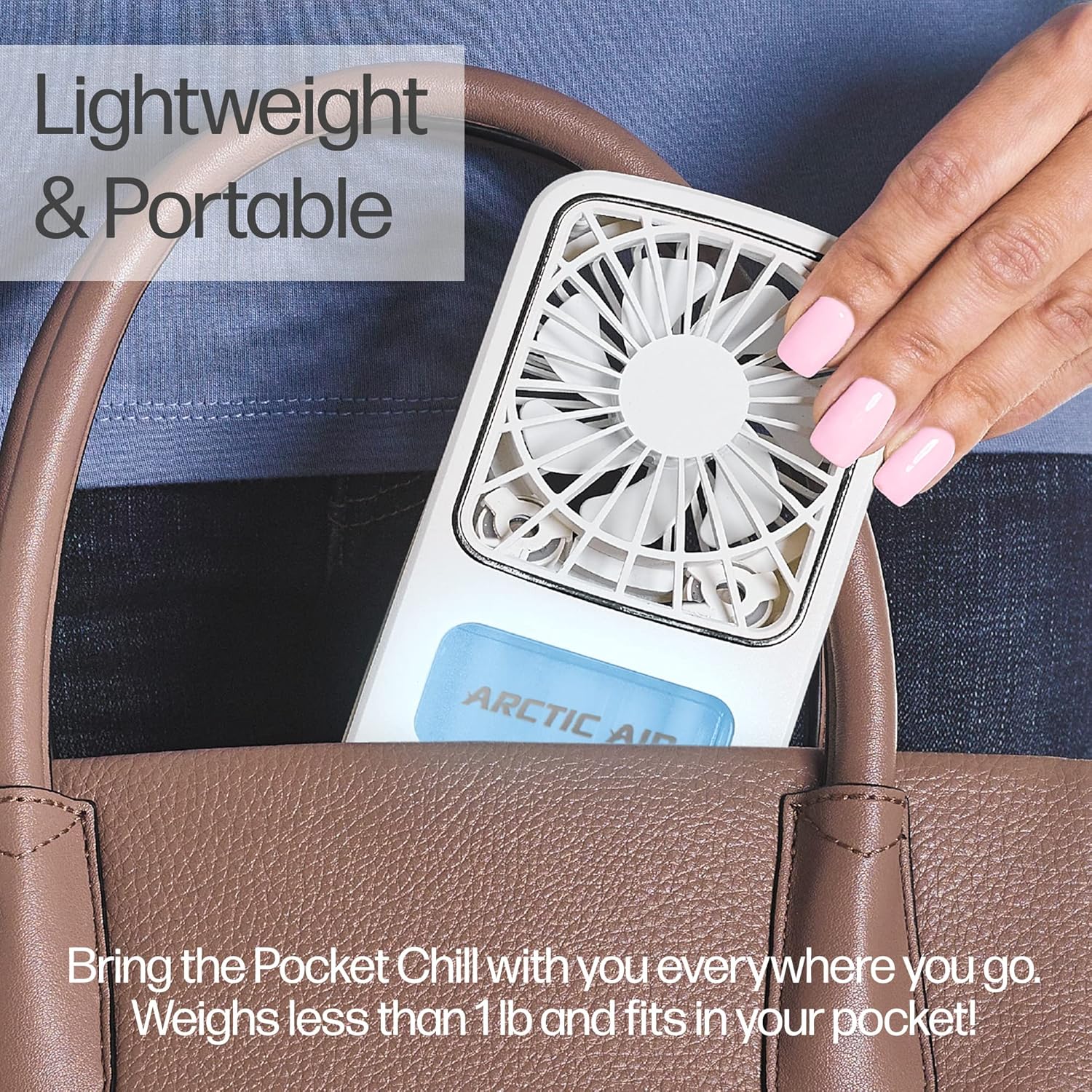ARCTIC AIR POCKET CHILL Portable Personal Fan Carry your comfort in your pocket with the Ontel Arctic Air Pocket Chill a personal air cooler that gives out gentle, refreshing air all day, every day, no matter where you are. With HydroChill Technology and dual cooling jets, this mini air conditioner turns hot, dry air into cool breeze, giving you the finest air quality indoors and outdoors. Simply fill the water tank, press the button, and enjoy soothing air flow for up to 12 hours on a single charge runtime depends on speed setting, room temperature and humidity levels. Featuring inbuilt LED light with 7 color options and 3speed settings low, medium, and high, and simple touch controls, this pocket cooler is the perfect aircooling system for home, sitting on your office desk, sporting events, travel and much more. Comes with a builtin kickstand to easily convert it into a desktop fan for handsfree operation. This aircooler and humidifier is small, lightweight and easytocarry, and a travelfriendly choice for summers.