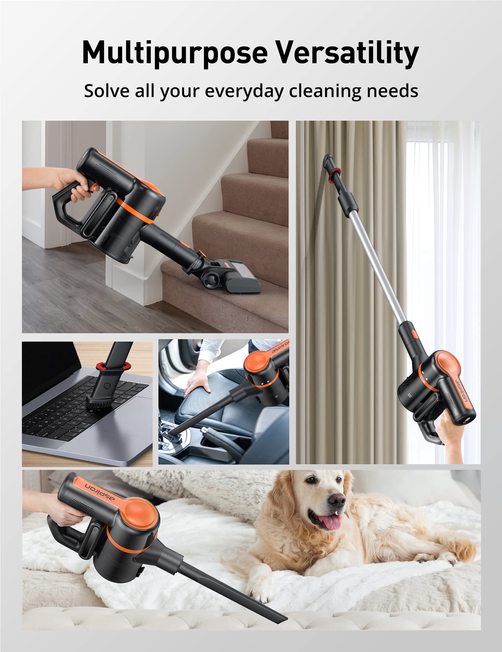 • MULTIPURPOSE VERSATILITY: Aspiron cordless vacuum is ready to solve all your everyday cleaning needs with a motorized brush, long crevice nozzle, 3in1 nozzle and extendable tube to easily clean up high, low, narrow places, sofa, stairs, cars, keyboards and more.