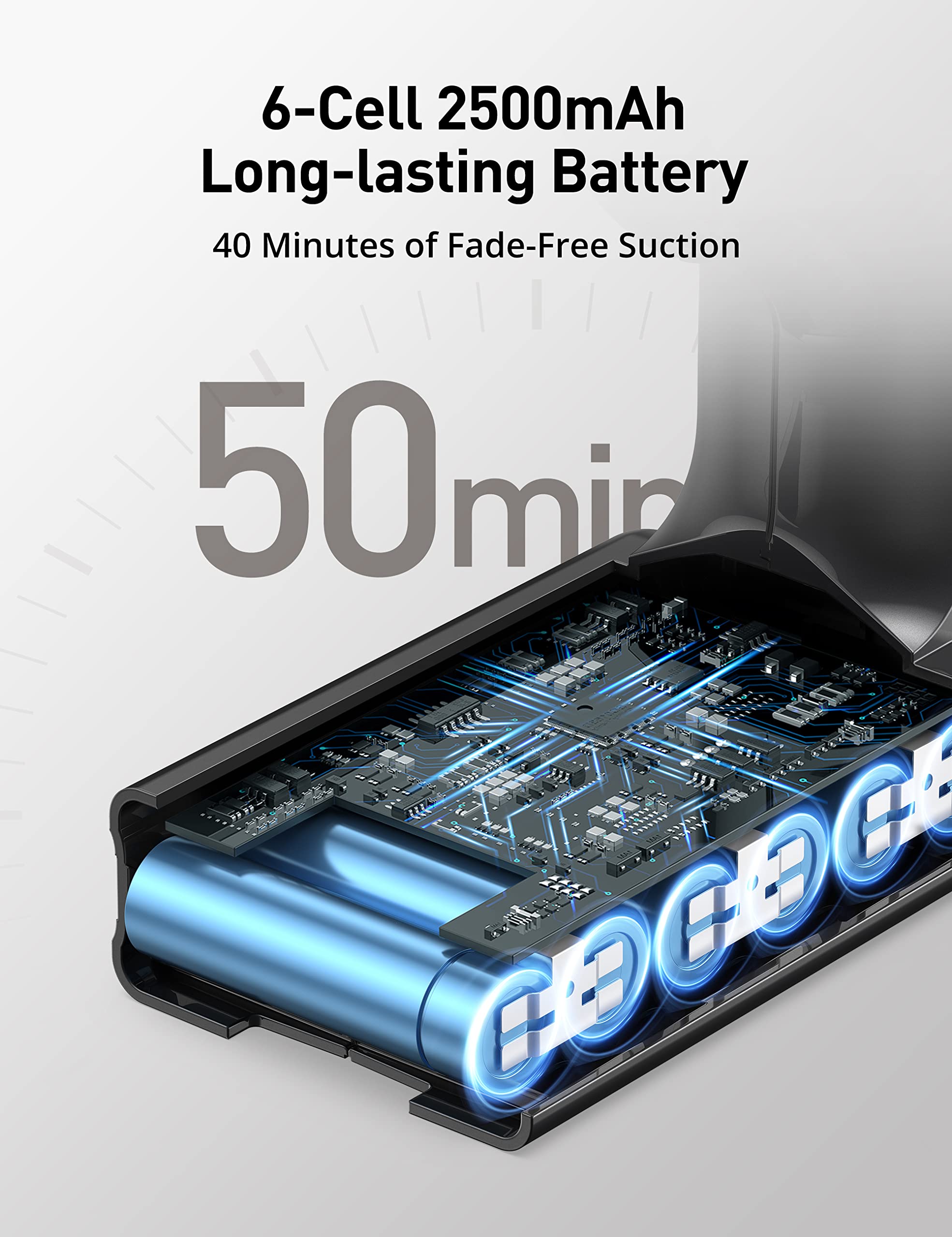 • 50 MINS EXTRALONG RUNTIME: Powered by 6cell 2500mAh rechargeable lithiumion battery, this cordless vacuum cleaner provides up to 40 minutes of fade suction to deep clean your entire space