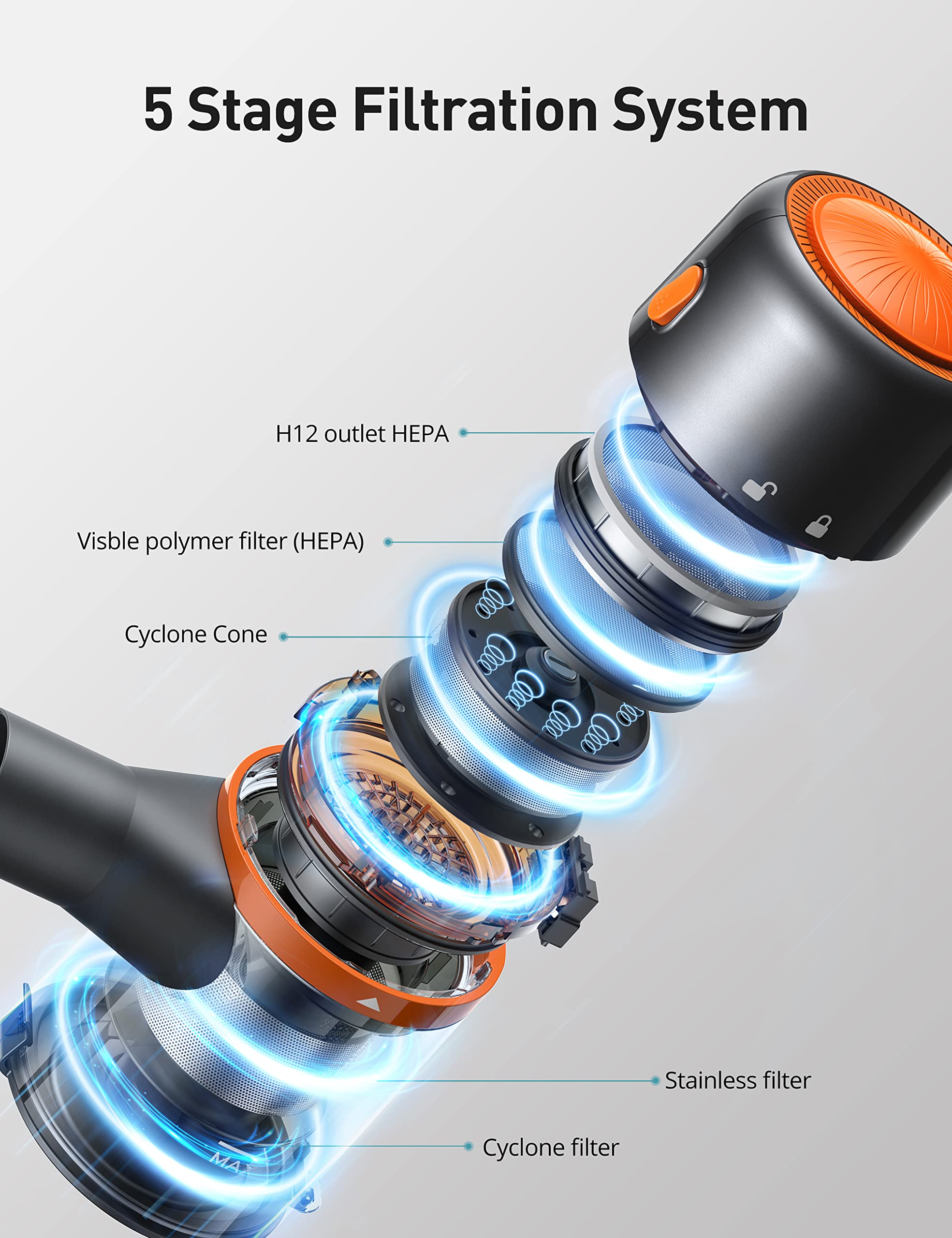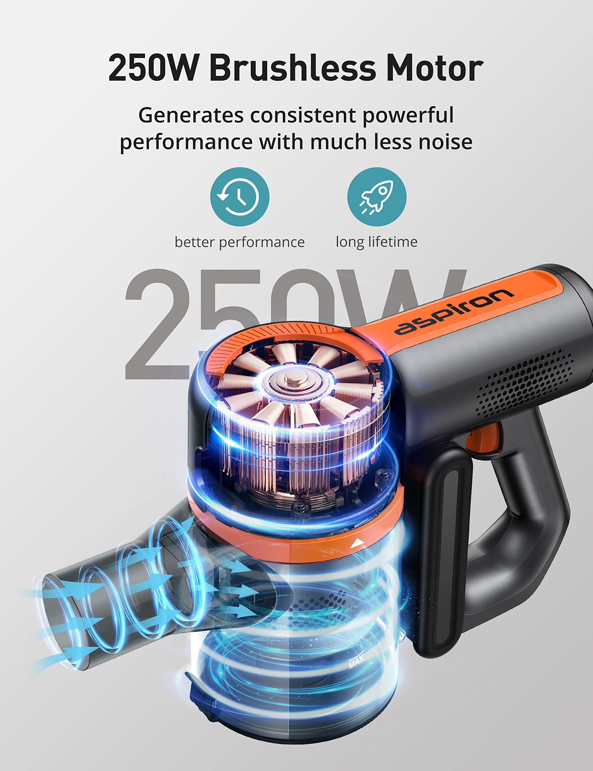 • 25Kpa HIGH EFFICIENT VACUUM CLEANER: With the 250W brushless motor and 75,000rpm spinning, this cordless vacuum cleaner generates strong suction, powerful enough to pick up dirt, debris and pet hair in a single pass,cleaning rate reches to 99