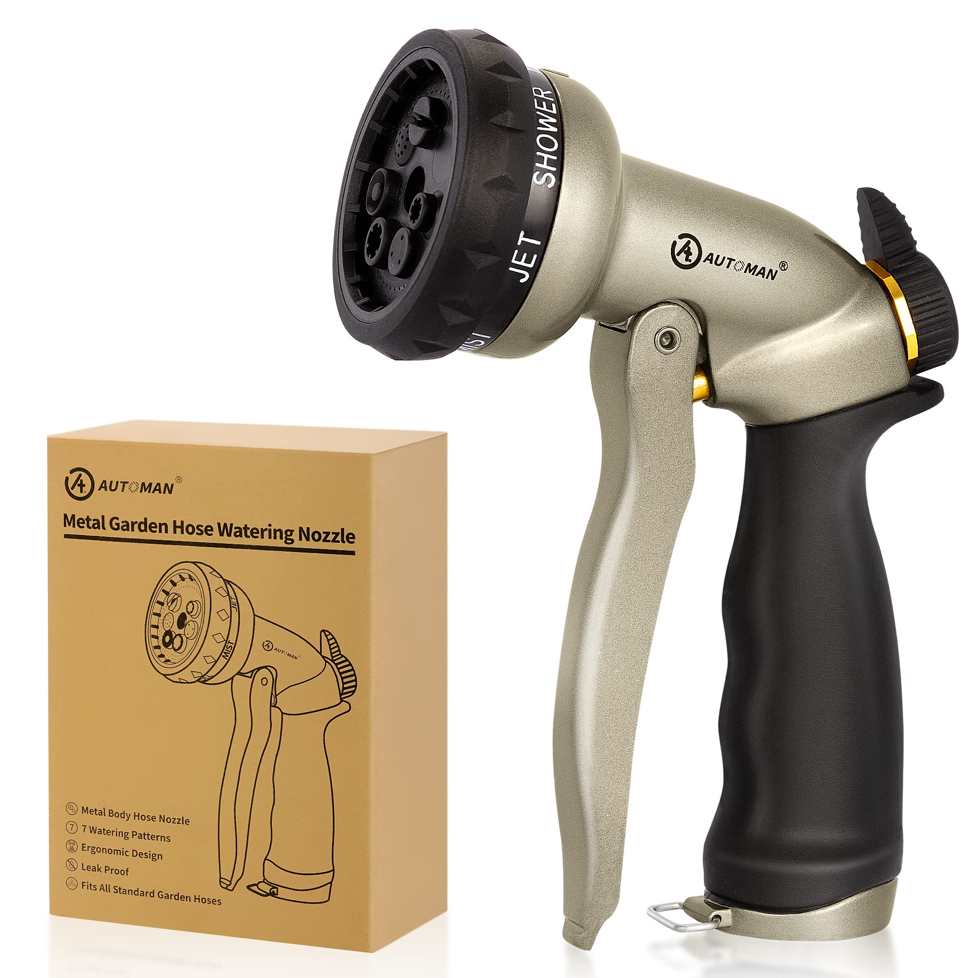 100% METAL CONSTRUCTION: The AUTOMAN garden hose nozzle is built using heavy duty metal. It better stands up to impacts and resists corrosion. The shock resistant rubberized bezel dial protects the nozzle from accidental drops. Our garden nozzle is 100% metal and high quality to prevent leaks, rusts and corrosions, much more durable than the plastic water nozzles. 7 PATTERNS WATERING MODES:Our hose sprayer nozzle has 7 spray pattern options.You can rotate the spray head of the nozzle to choose the required pattern, easily switch between Jet,Shower,Mist,Cone,Flat,Full and Center setting as you need,from misting the flower bed to jet washing the hard surfaces using our high-pressure nozzle.Perfect for watering your garden,patio,lawn,grass and flower beds, it is also ideal for washing cars, cleaning windows, bathing pets & dogs. LEAK-PROOF & FITS ALL STANDARD GARDEN HOSES:This water hose nozzle has a threaded connection and attached a rubberized gasket to prevent leaks and provide a durable tight seal. Fits all USA standard garden hoses - 3/4” Garden Hose Thread (GHT). Besides, with a water flow adjustment, users can easily increase or decrease the water pressure, allowing for more precise watering. This feature helps conserve water and reduce wastage. LABOR-SAVING DESIGN & REDUCE FATIGUES: Ergonomically, our hose nozzle stands out because of the comfortability with long lever handle holding on the hands, and it features a nice lock bar at the bottom of the handle for continuous spraying without applying for any pressure. Therefore, it is very ideal for prolonged use without stressing your wrists! WIDE APPLICATION: The garden nozzle is suitable for a wide range of applications, including watering plants, washing cars, cleaning windows patio furniture, pet showering and more. The nozzle's high-pressure jet setting can easily clean dirt and grime, while the soft shower setting can gently water delicate flowers and plants in the garden bed. You can use it in your home, garden, or garage, making it a versatile tool that you'll reach for time and time again.