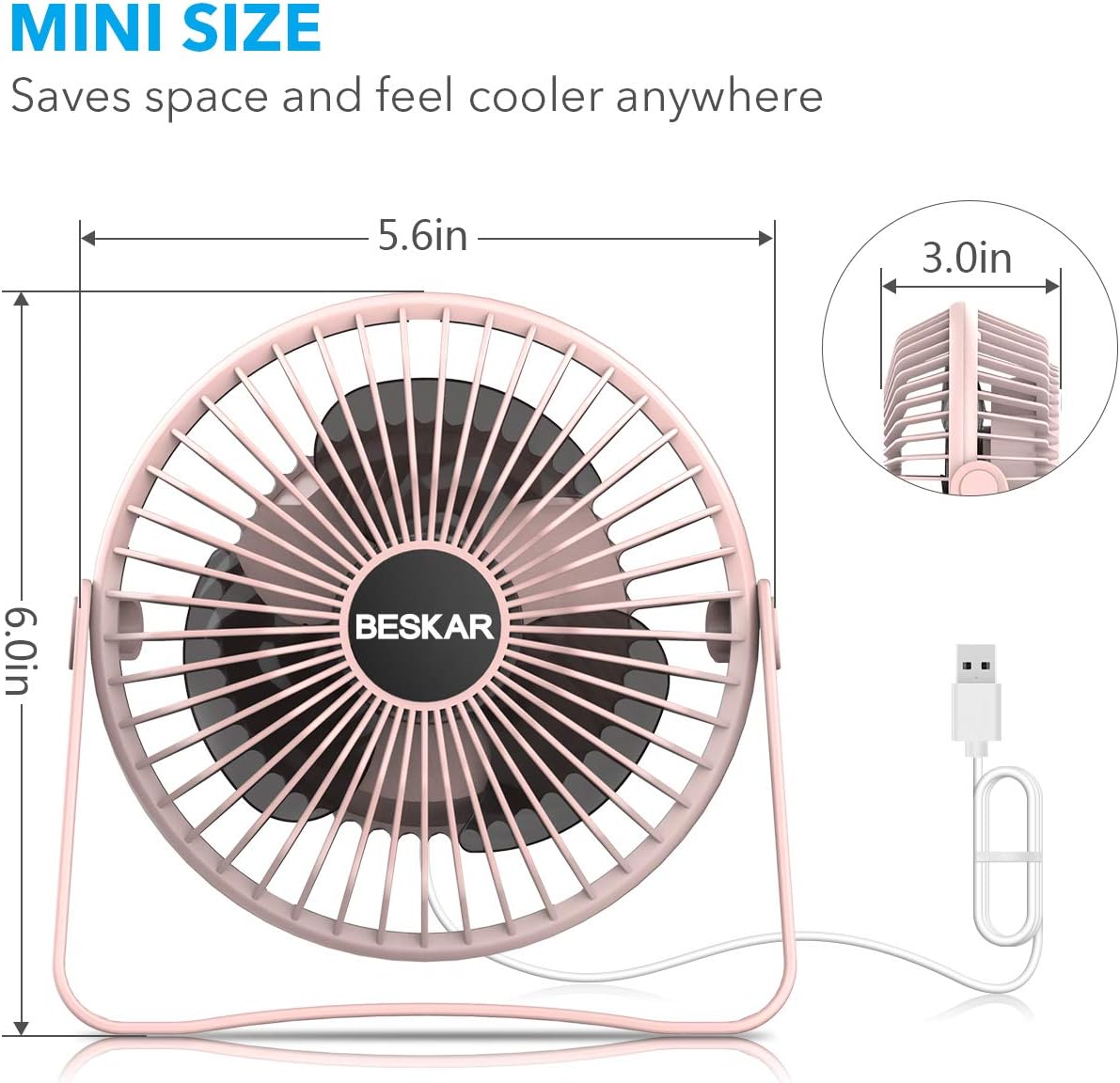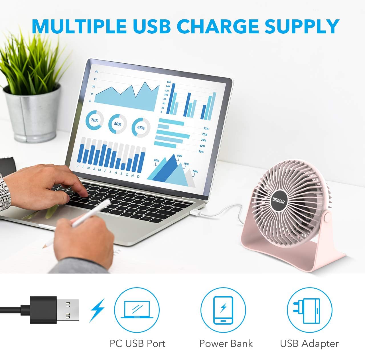 Are you badly bothered by hot flashes during hot days on summerAre you need more air circulation at your home and officeAre you looking for a multipurpose fan can be used indoor or outdoorBESKAR Mini USB Desk Fan will Help You with All the Troubles. Cool Your Summer No Matter You Are Working, Studying, RestingWhy You Choose BESKAR USB Table Fan1. USB fans advanced brushless DC motor to create powerful airflow and energy saving2. CVT variable speeds mode to choose the appropriate fan speed as you wish3. Unique blade design to engineered be 25 Quieter.4. 40° Adjustable tilt to adjust the direction of the airflow suitably.5. mini size to save space and portable.6. Durable and environmentally ABS material to keep use safely.7. Antislip rubber base on the bottom ensures high stability and no vibration.8. Multiple power supply, the usb fan compatible with computers, laptops,, car charger, usb power adapter.◈ CVT variable speeds◈40° Adjustable tilt◈mini portable size◈ 3.9 feet USB Cable◈ Noise ranks from 25db to 50dbNote: For better performance, 2A USB port is highly recommend to use. AC USB adapter is NOT included