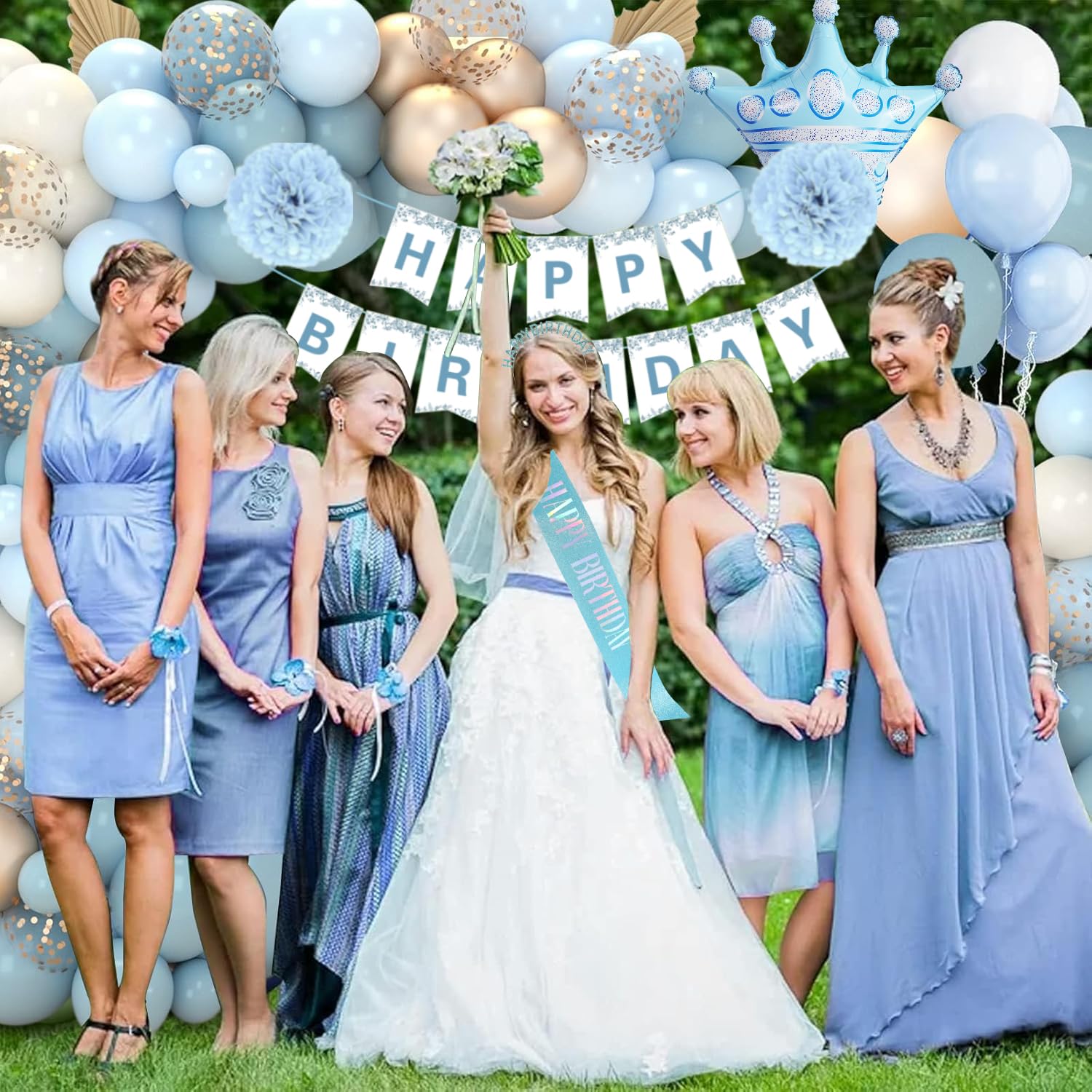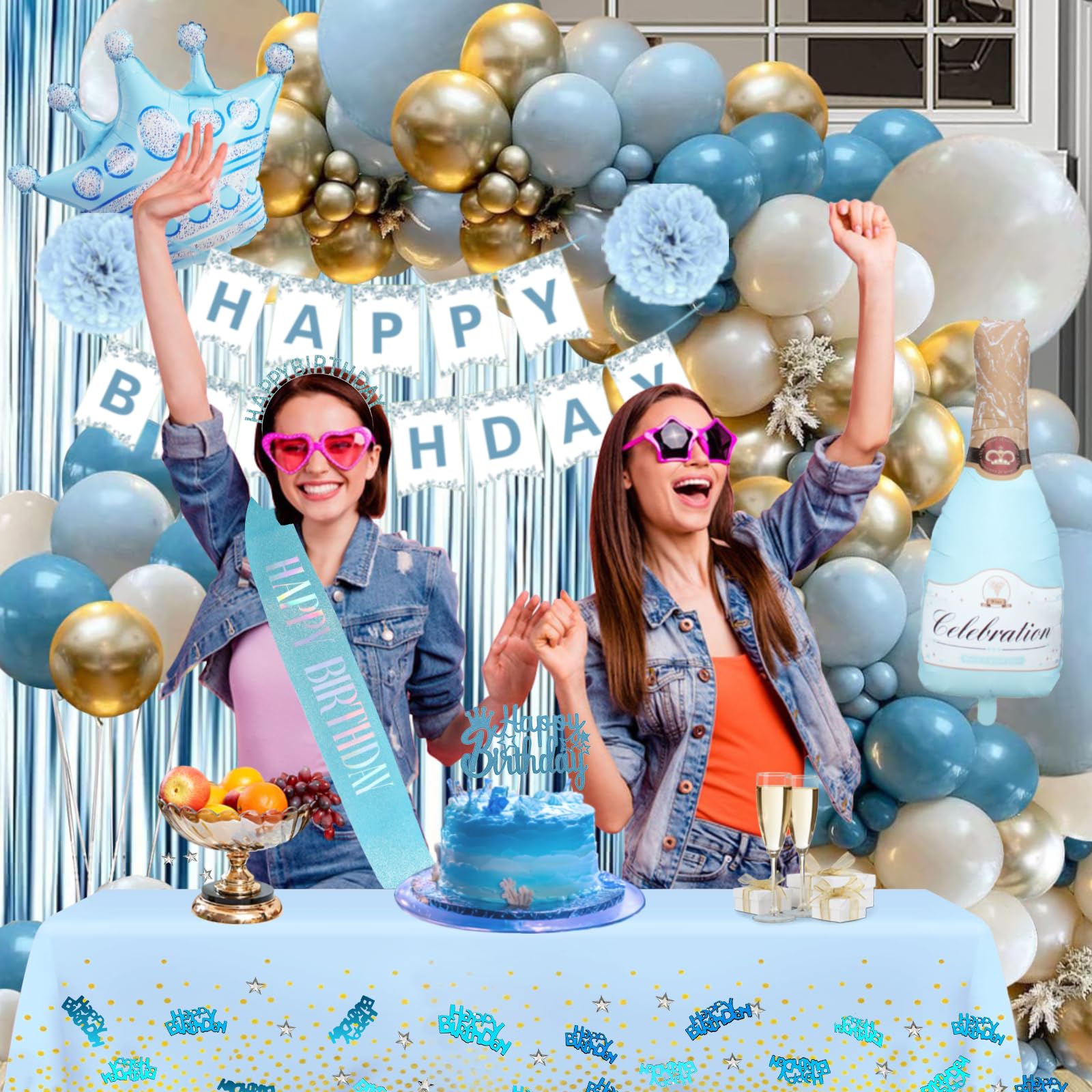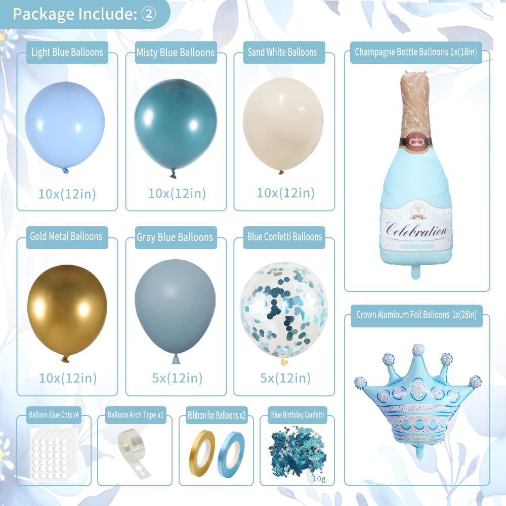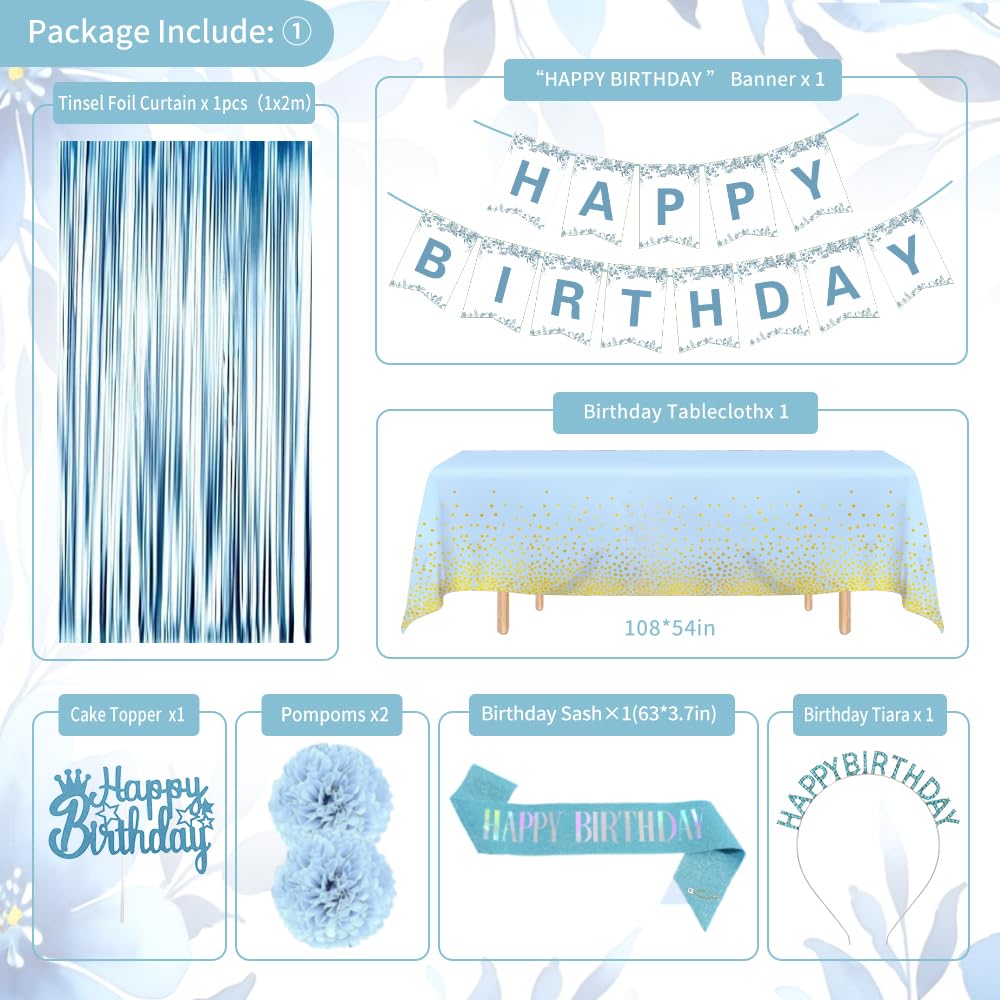 Birthday Decorations Blue: This blue happy birthday decorations pack includes 1pc Happy Birthday Banner, 1pc light blue sash 63 x 3.7in, 1pc blue tiara 5.9 x 6.5in, 1pc blue tablecloth 54 x 108in, 1pc streamers rain curtain 39 x 79in, 10pc dusty blue balloons 12in, 10pc light blue balloons 12in, 10pc gold metallic balloons 12in, 10pc sand white balloons 12in, 5pc gray blue balloons 12in, 5pc blue confetti balloons 12in, 2pc foil balloons, 2pc pompoms, 1pc cake topper, 10g blue confetti, 2pc 10m ribbon, 4pc glue, 1pc 16 foot balloon chain. Durable Material: Birthday banner are made of metallic foil and quality card stock, not fragile and not easy to bend; Use these as the party backdrop! Balloons made of natural non-toxic latex and high quality aluminium foil, strong and durable, and the photos taken with the fringe curtain hanging decorations in the background. Our sash is made of double face satin fabric with silk feel and luster, Don't fret if your sash comes with a few wrinkles! If ironing is needed, please press the sash from the back not the front, and use a moderately warm iron. Time-Saving Setup: Setting up this light blue party decorations is quick and easy, we deliver balloon strips, point and band adhesive to help you manufacture balloons arches, allowing you to save time and focus on enjoying the party with your family and friends. Cleaning up after the party will also be effortless. Give free rein to your creativity and create the perfect party atmosphere. Wide Application: WEQTWL happy birthday decorations blue supplies are great for birthday decorations, frozen birthday party, under the sea themed birthday, baby blue birthday decorations, birthday decorations for women, birthday decorations for girls, blue decorations for party, The refreshing and healing blue balloons garland combined with gold, nude, white, etc. Add a natural touch to your party, making you and your friends more joyful to enjoy the party! Customer Service: We are committed to providing you with the highest quality and full customer satisfaction. If you encounter any problems about set or need help, please feel free to contact us, we will reply to you within 24 hours to help you solve the problem! We attach great importance to customer satisfaction, please feel free to buy