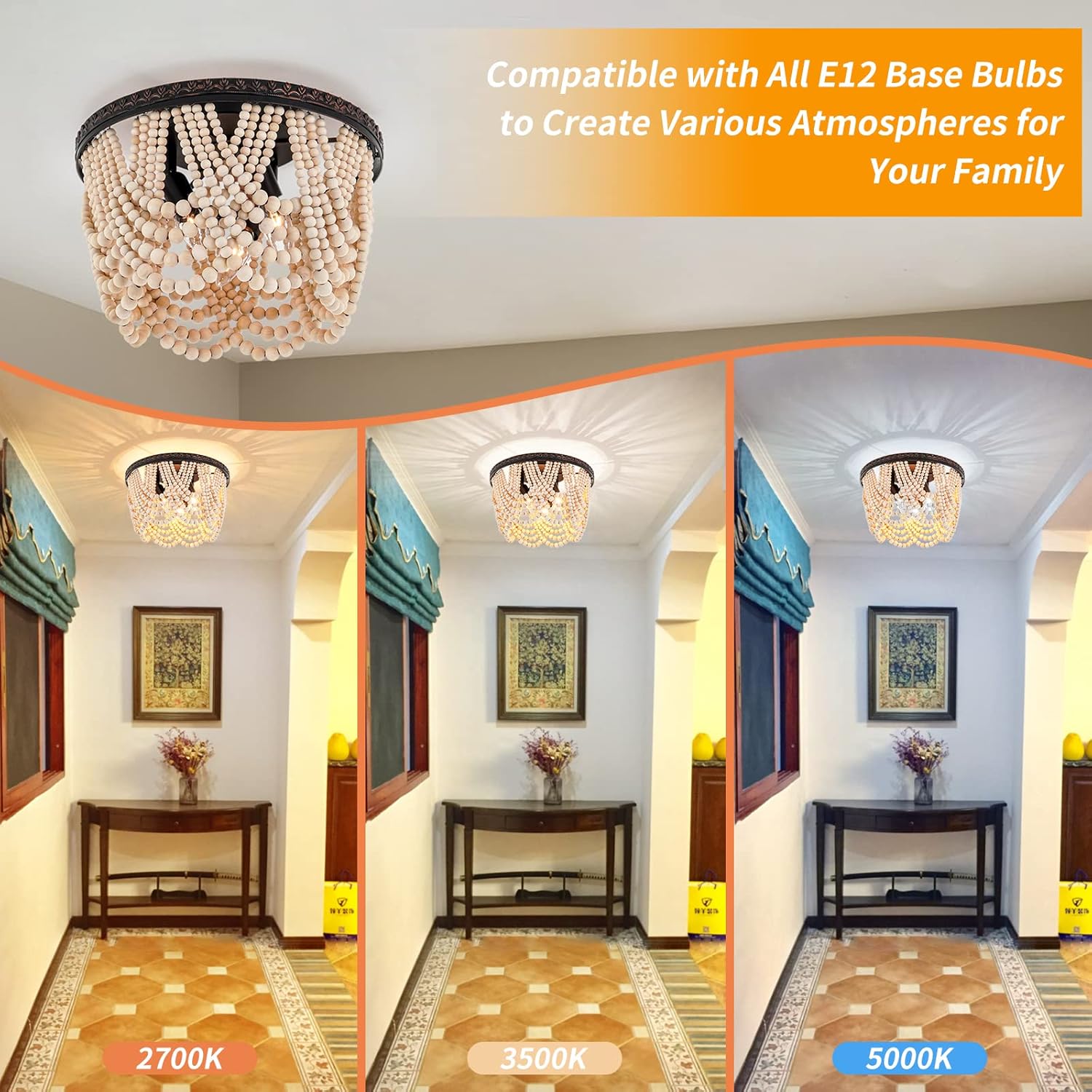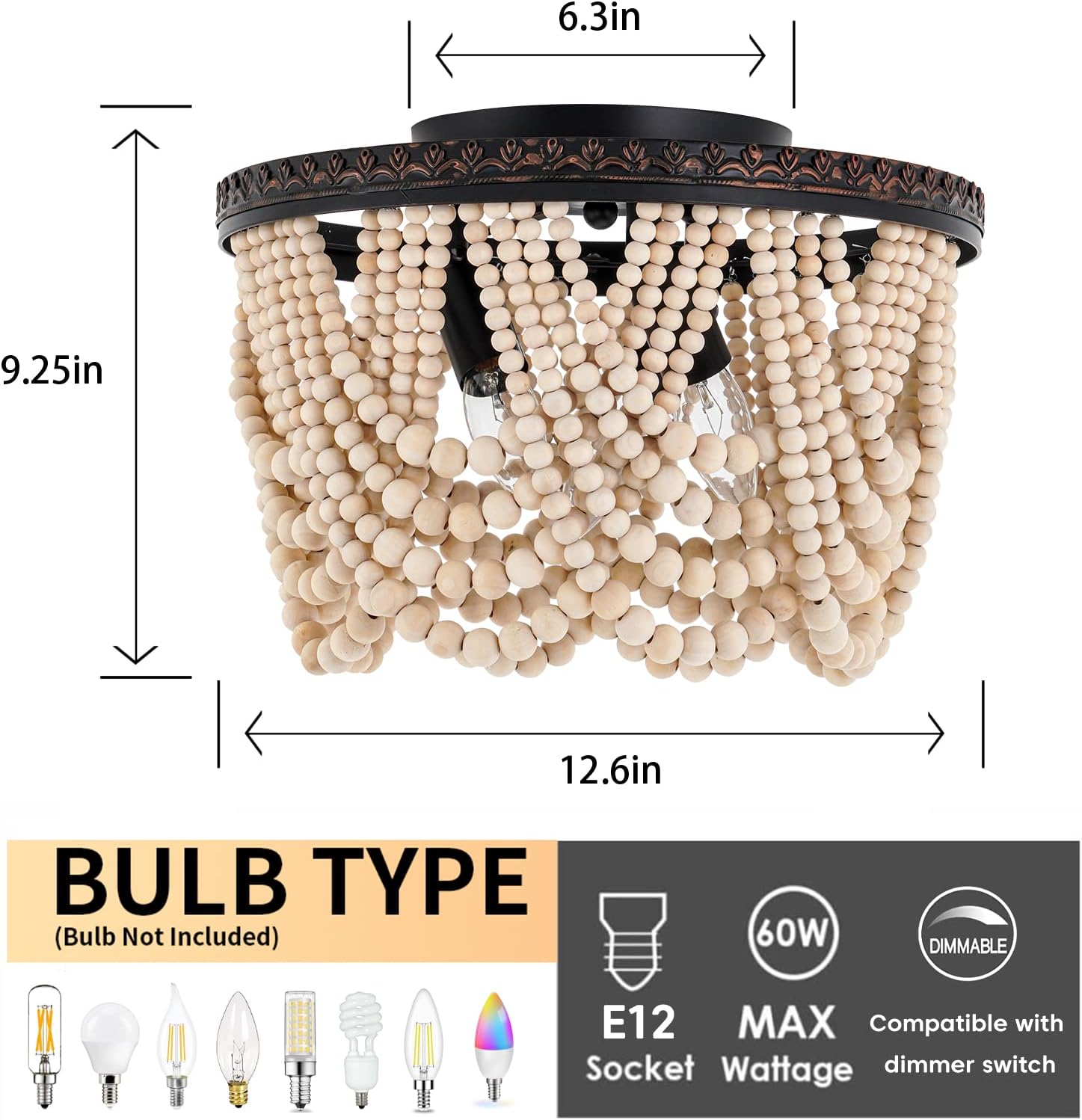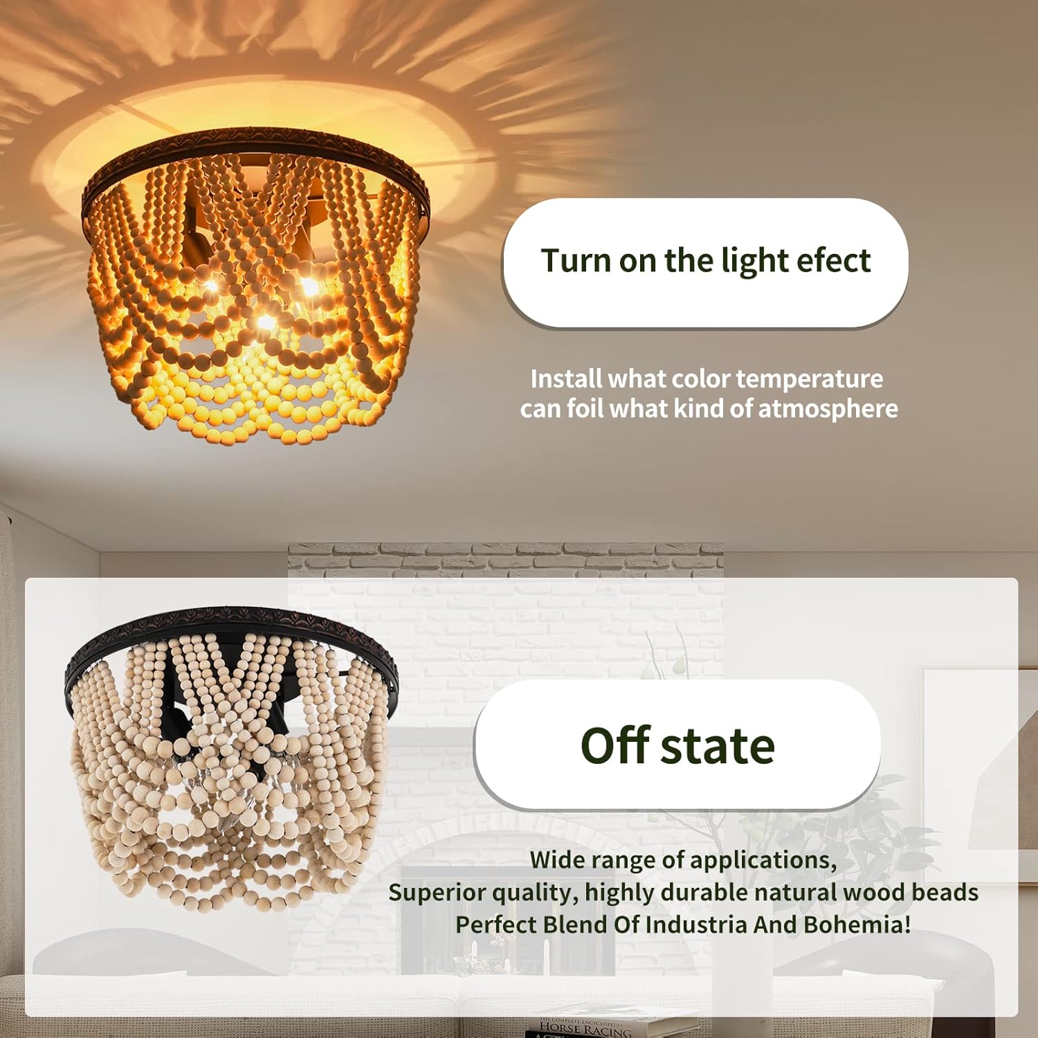 Boho Wood Beaded Chandelier, Bohemia 3 Lights Flush Mount Ceiling Light Fixtures With Engraving Pattern, Farmhouse Chandeliers For Living Room Passway Foyer Entryway Hallway Nursery, Oil Rubbed Bronze