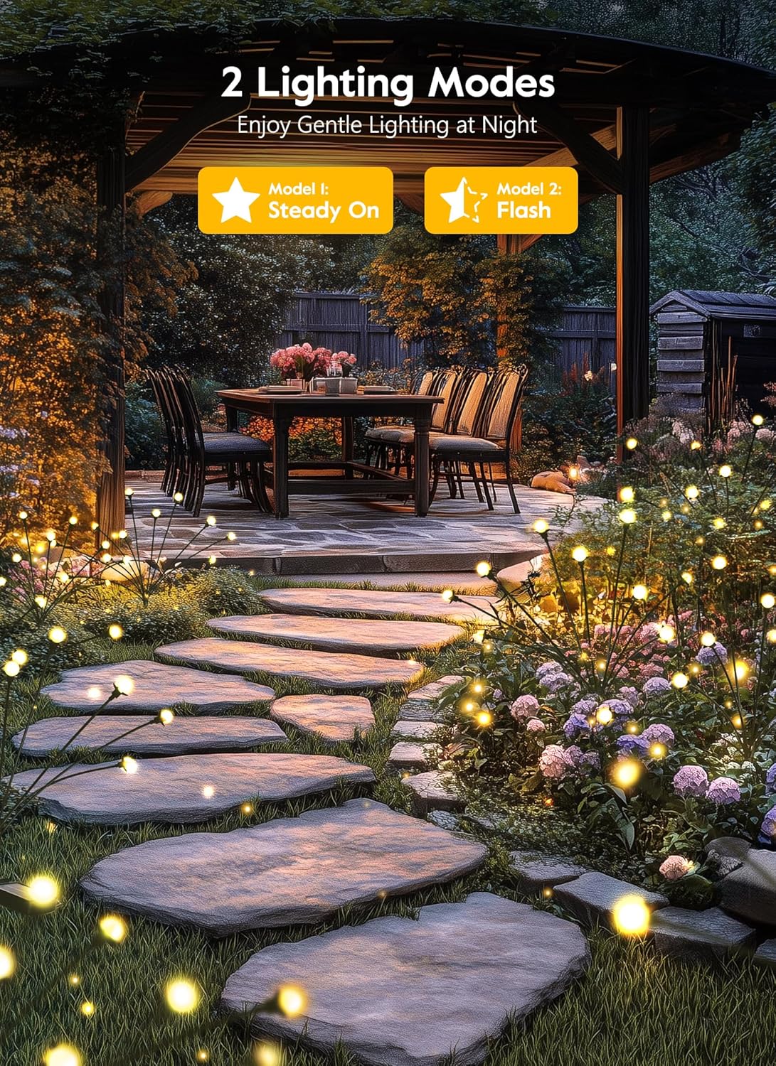 Swaying with Wind, Like Magic Appearing in Your Garden - When the breeze blows, solar powered firefly lights sway with the wind, dance like fireflies in garden. Our solar swaying lights use more flexible stem than other garden solar lights, easier to move with wind, without clumping together, and bend to the direction you want. Get now and use your imagination in decorating your yard 2 Lighting Modes - 4 pack solar garden lights decorative with 12 white globes, warm white flashing and steady on lighting optional. Turn the switch to "ON" for "Steady on" mode, slide to "FLASH" for "Flash" mode, fantastic for creating a beautiful picture of group of fireflies flying and dancing in joy at your garden, patio or lawn Bigger Solar Panel: Upgraded firefly lights solar outdoor with built in 1.2V, 600mAh Ni-MH battery, 4-6 hours fast charging for 10-12 hours operation, 120 degree adjustable for direct sunlight Auto On/Off: The outdoor garden lights will be auto on at dusk and auto off at dawn.No wire connection and household electricity required, just place the solar firefly garden lights in sunlight, and no need manual adjustment, it will charge at day and light up at night automatically Solar Outdoor Lights Waterproof: IP65 Waterproof garden lights solar powered is great decor for restaurant, cafe, yoga studio, gym room, outdoor party, wedding, birthday, flowerbed, lawn, backyard, walkway, path, pathway, sidewalk, driveway, street, window bay, backyard, park, national day