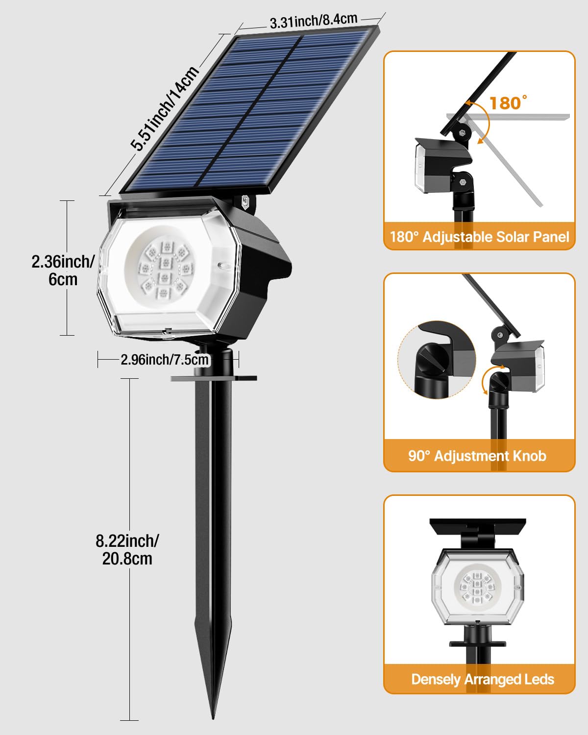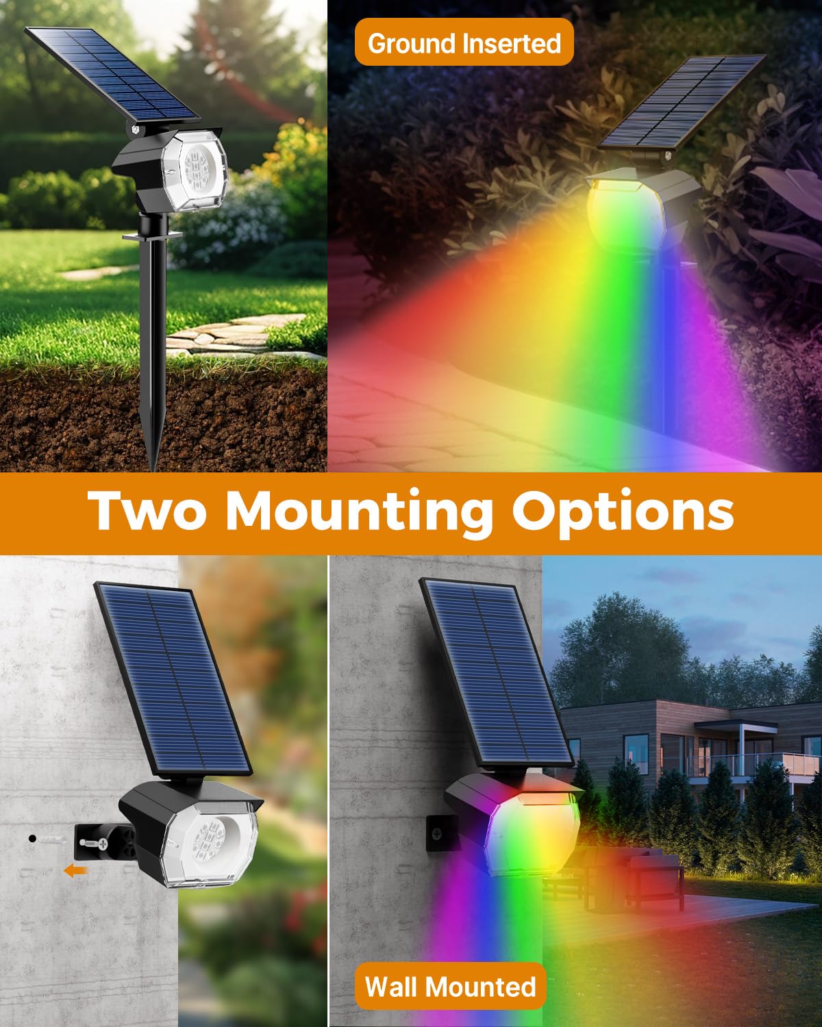7 Color Changing Options: RGB led solar spotlight 6 fixed color modes and 1 automatic color change mode in both dynamic and static state. Bright and colorful, allows you to customize the ambiance for Halloween, Christmas, or daily garden lighting Auto ON/OFF & Adjustable Solar Panel: Powered by solar energy, automatically recharge for 6-8H during the day and illuminate for 8-12H at night. With 1500 mah battery capacity, the solar panel can be adjusted up and down max 180° to capture the sunlight