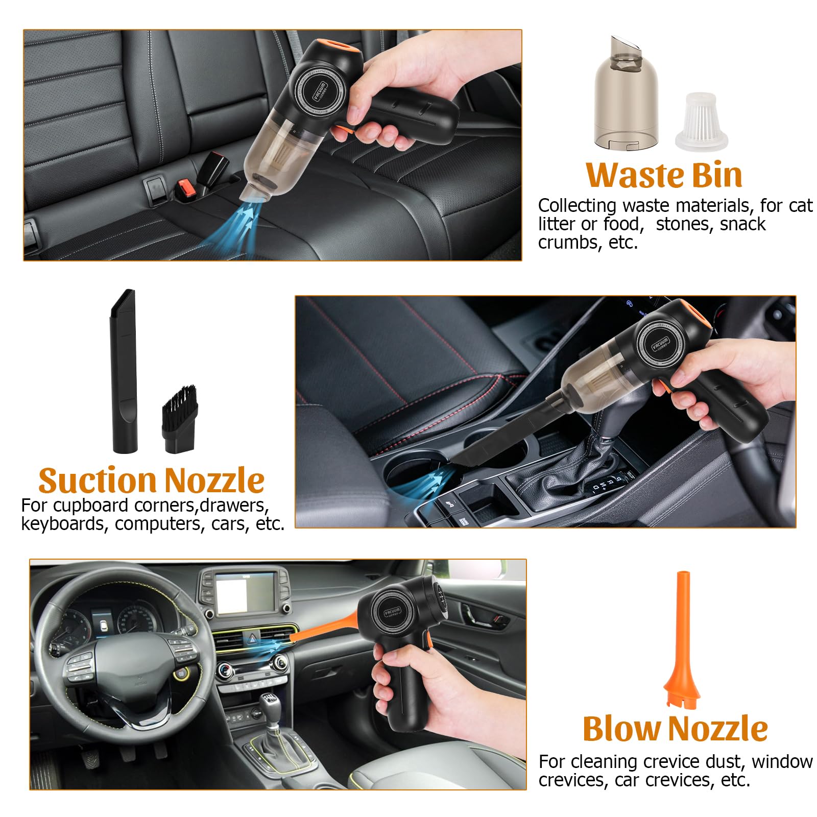 • 【A FULLY FUNCTIONAL VACUUM CLEANER】This car vacuum has a brushed motor, 120w super power, with two functions of blowing and suctioning, 9000pa suction power is enough to easily suck dirt, debris, dust and other particles from the surface of items. After switching direction and replacing the blowing nozzle, the mini vacuum cleaner can blow out the tiny dust in the keyboard, nooks and crannies, deep cleaning, so that there is no place for dust to hide everywhere, and make your items look brand .