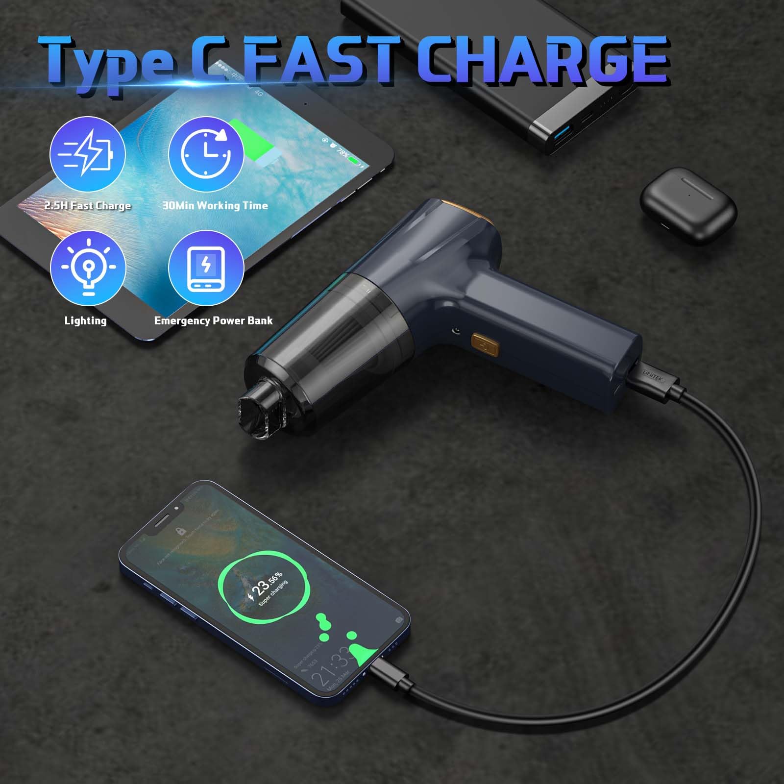 • 【3 in 1 Vacuum Cleaner】This mini car vacuum cleaner uses advanced 3 in 1 blowing and suction technology. It can not only inhale dust, but also inflate balloons or toys. Highpower handheld cordless vacuum cleaner has a powerful suction of up to 12000PA, which is sufficient to meet your cleaning requirements for dust, debris, sand, pet hair or some debris that is difficult to clean in the car or home