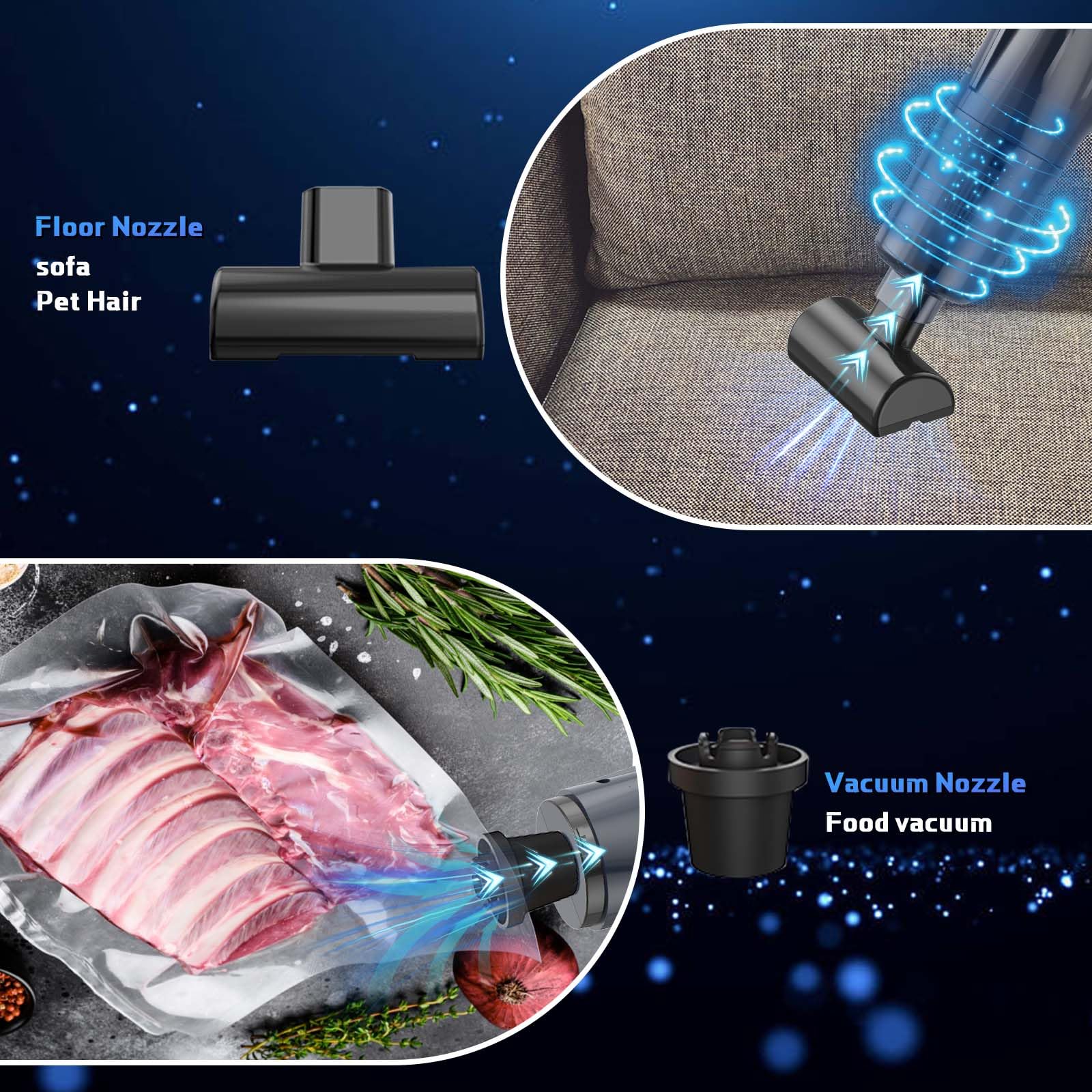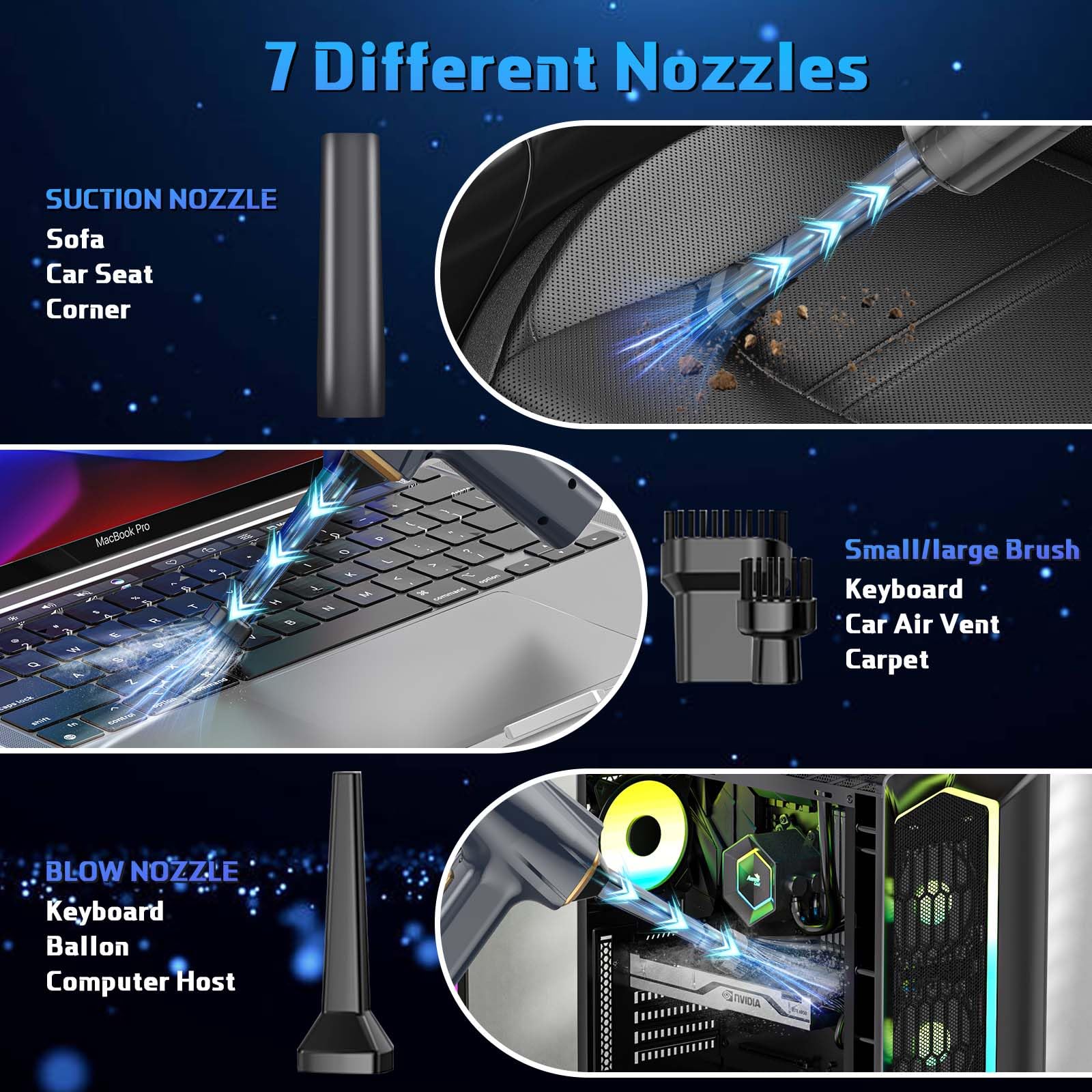 • 【7 pcs Multifunctional Cleaning Brushes】Portable vacuum cleaner for car contains 1Long Suction Nozzle 1Floor Nozzle, 2 Brushes Nozzle, 1 Blow Nozzle,1 washable filter ,1vacuum nozzle, which can be used as portable vacuum cleaner for computer vacuum cleaner blower, laptop vacuum cleaner, desk vacuum cleaner, car, pet room, piano, desk cleaning, etc.
