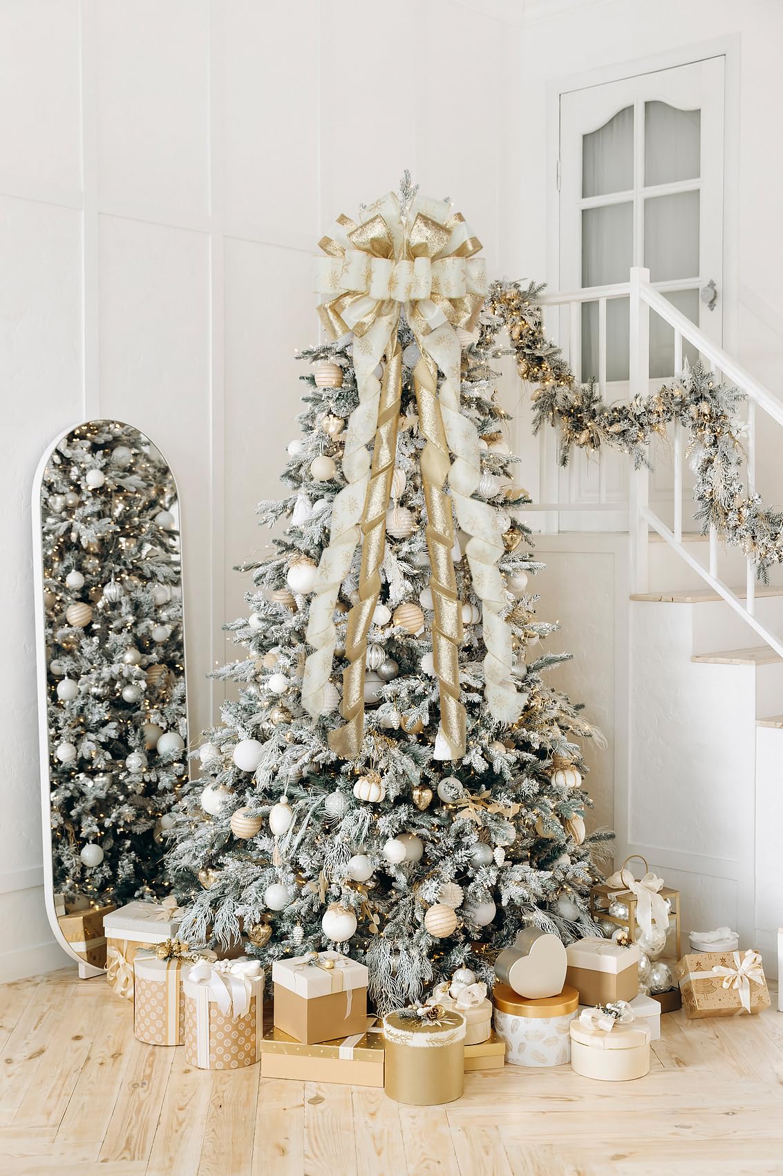 Large Size & Easy to Use: The topper bow measuring 53 x 13 inches and made from 2.5 inch wide wired ribbons. The long ribbon tails can be cut to your needed length, suitable for any size of Christmas tree. Our Xmas topper bows are all finished products and easy to use, just take out the Christmas tree bow, adjust the bow slightly to make it a perfect shape, tie the bow on the Christmas tree then put down the ribbon. This bow will surely add a strong holiday atmosphere to your home. Premium High Quality: Our Christmas decorative bows are handmade from satin and polyester fabric, not easy to tear or fade, lightweight and soft, easy to store, can be reused many times. This Xmas Bow ribbon surface printed with snowflake pattern which is very classic and elegant. Exquisite glittering materials on the bow looks very dazzling and attractive, providing a brilliant accent to your christmas decorations