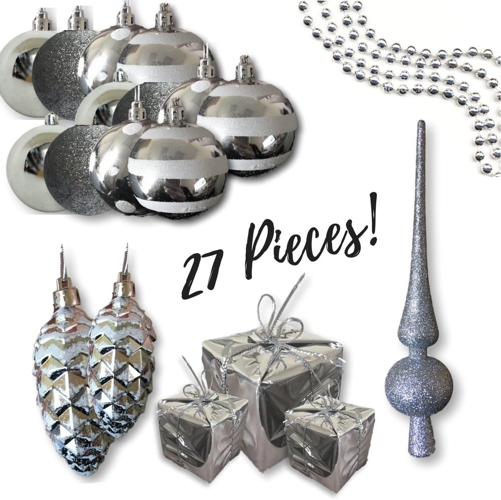 Christmas Tree Ornaments - Set of 27 - Assorted Styles and Shapes - Xmas Holiday Balls, Silver Presents, Shiny Pine Cones with White Glitter and a Tree Topper 1.5" to 3.5"