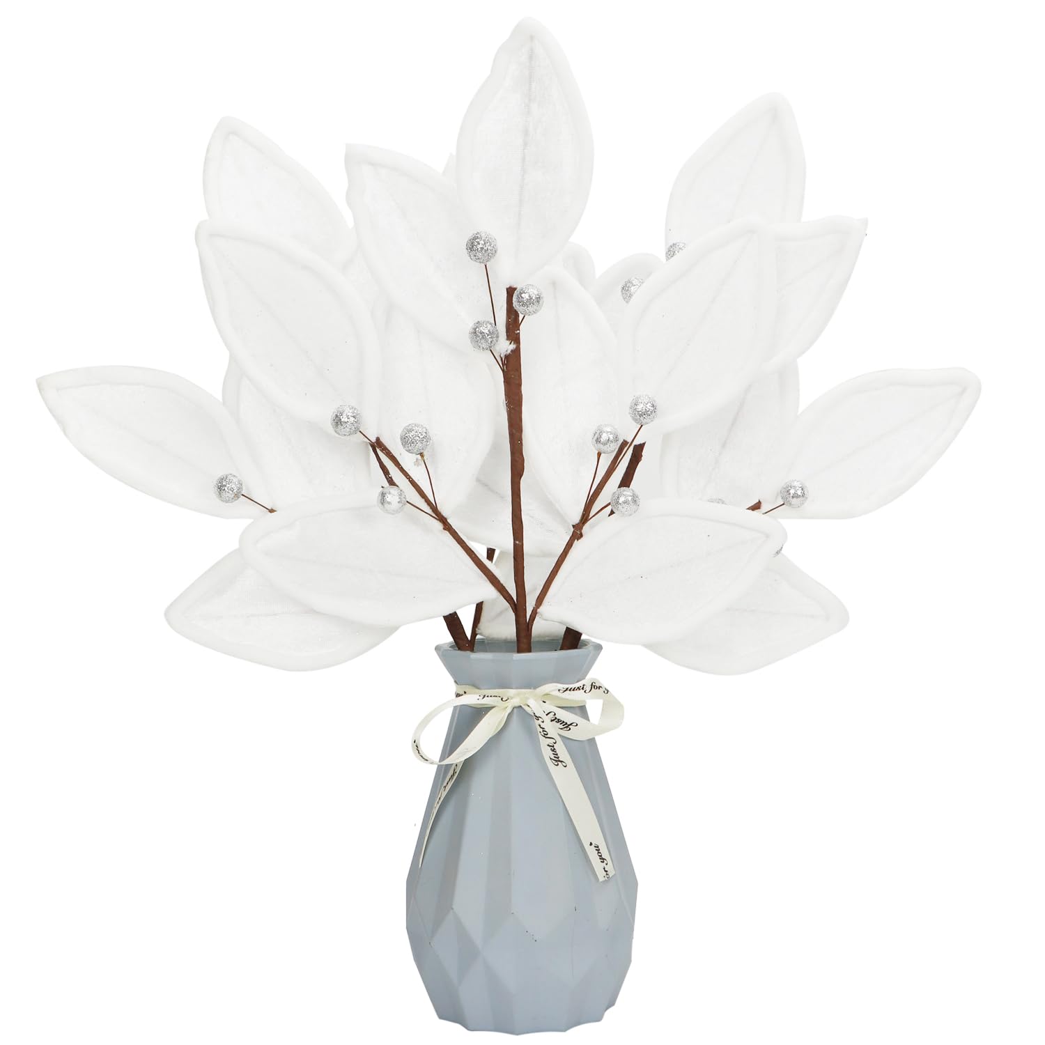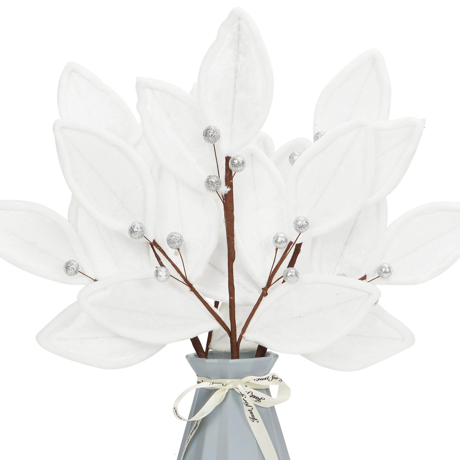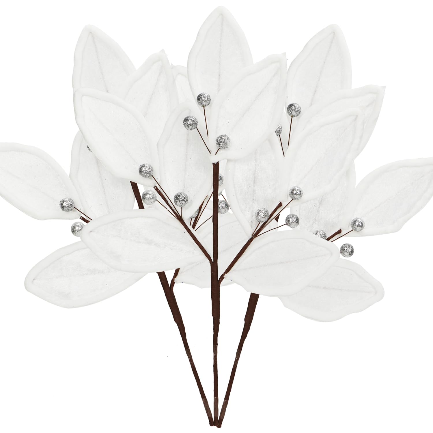 Christmas Tree Picks Leaf Berry Sprays Artificial Velvet Bay Leaves Holly Berries Stems Decorative Sticks for Xmas Tree Topper Vase Filler Branches Flower Arrangment Craft Home Decor Set of 3 (White)