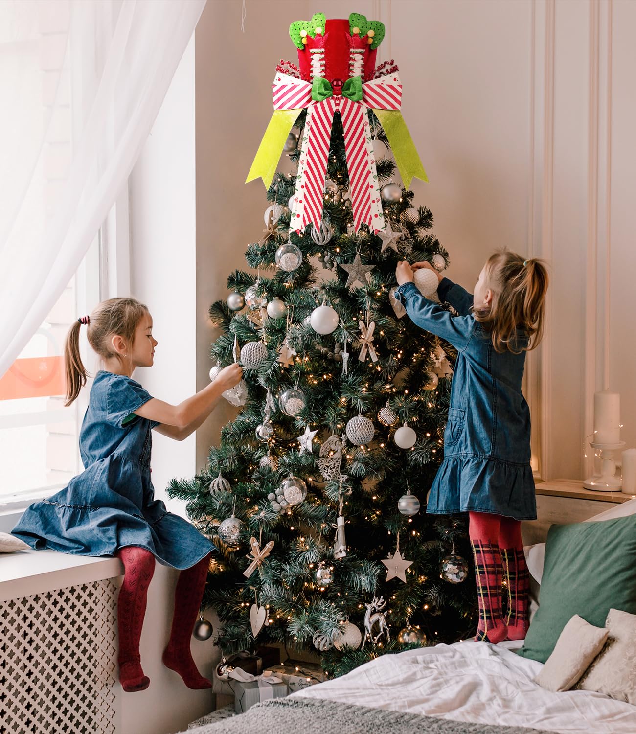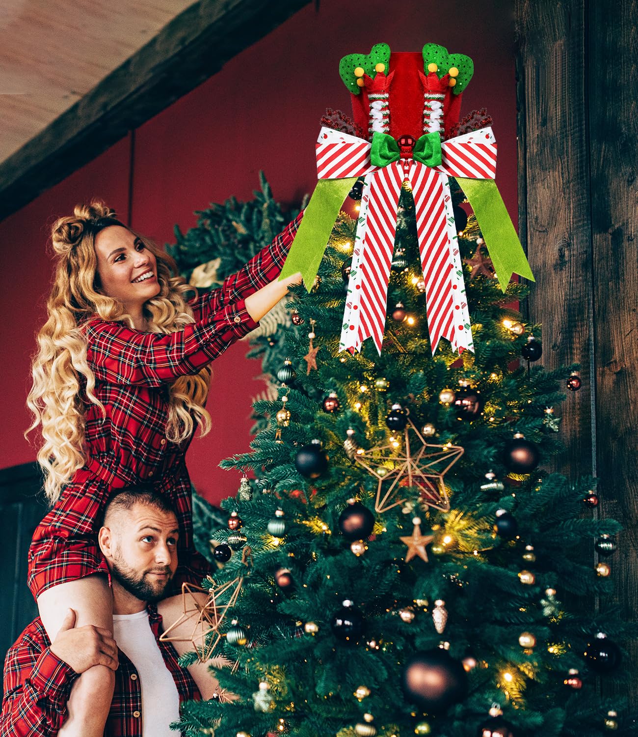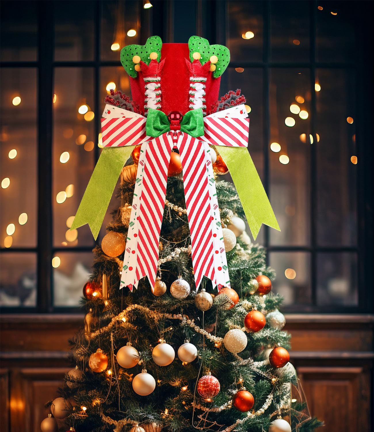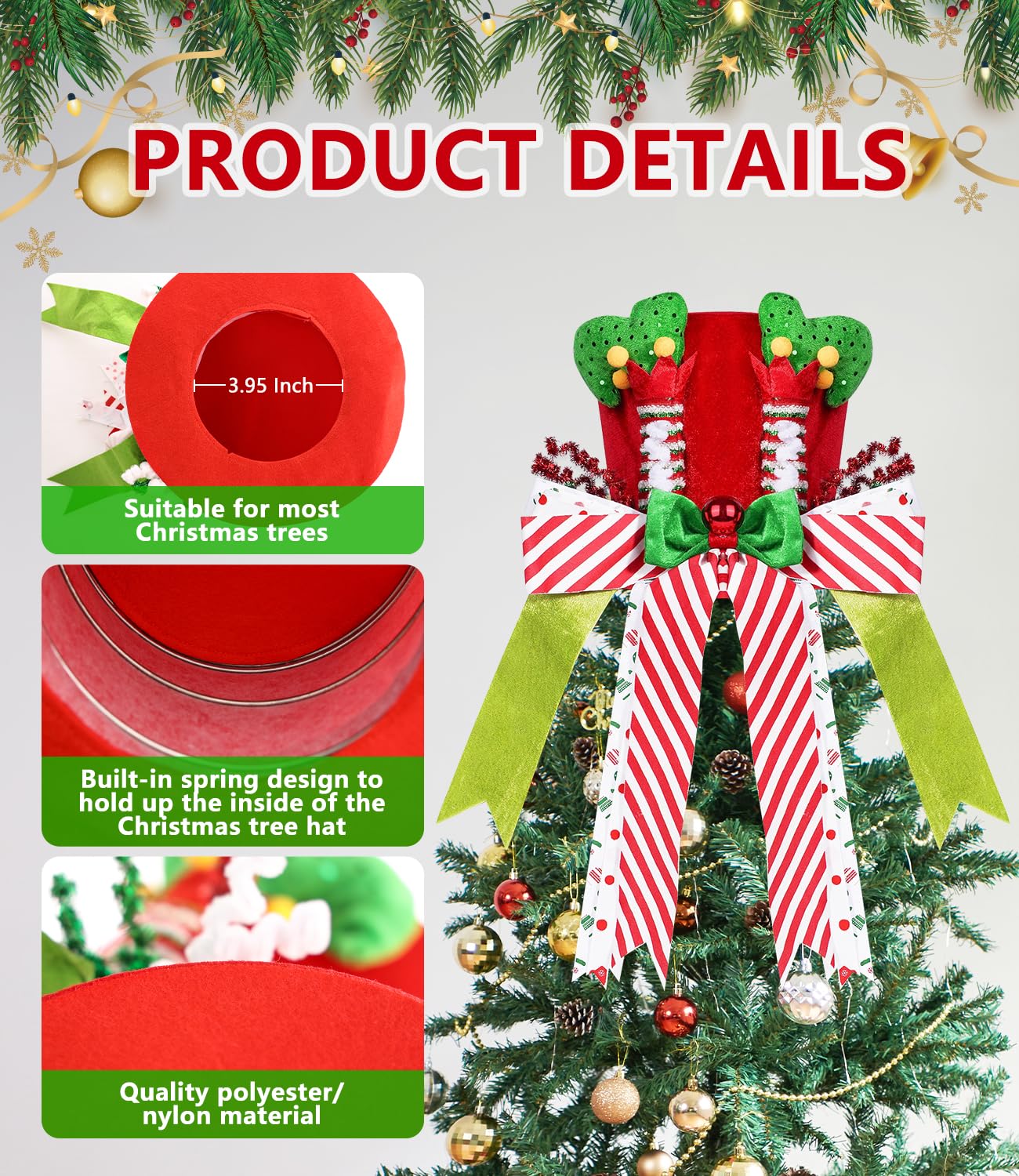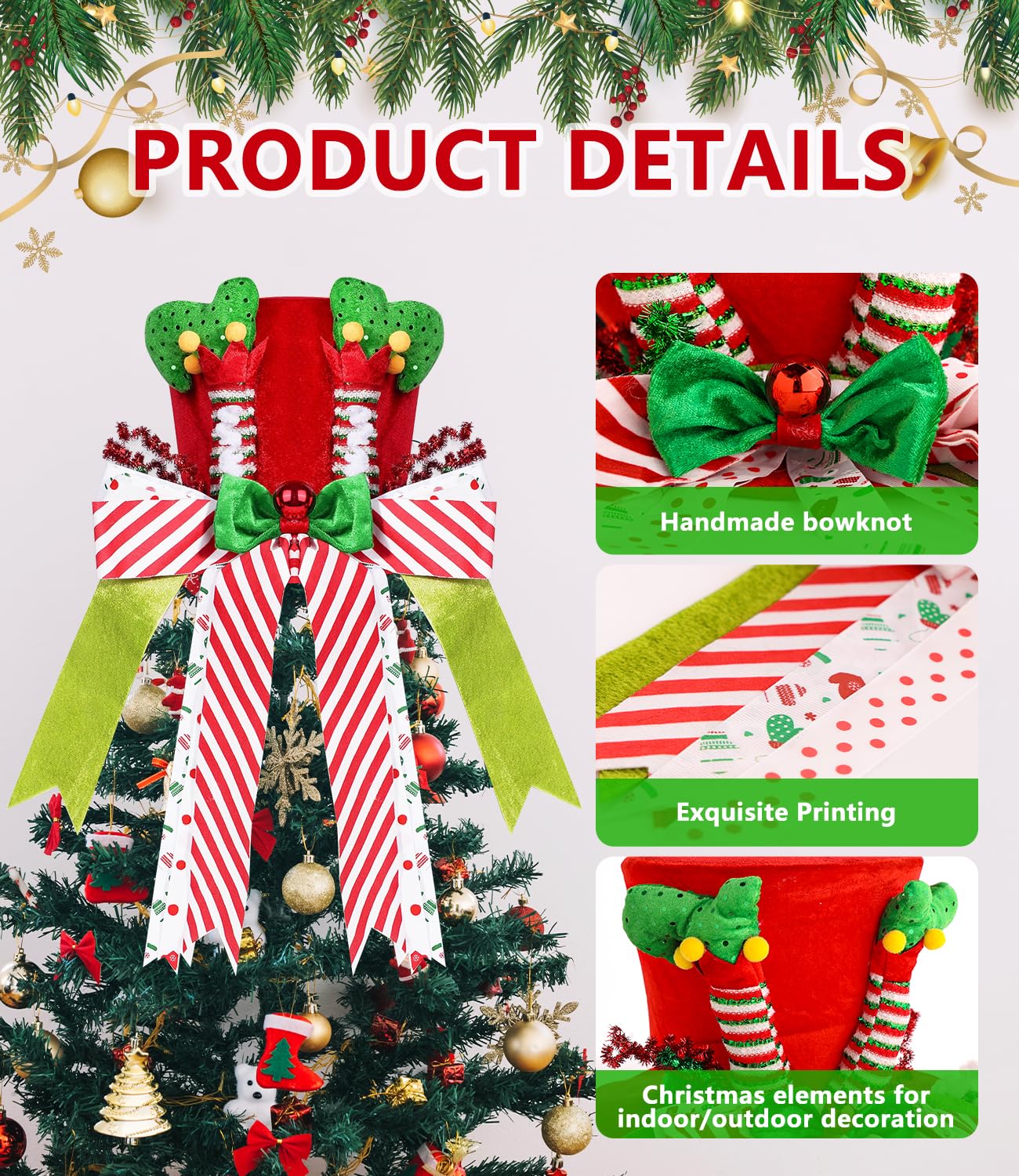 Christmas Tree Topper Hat, Elf Legs Xmas Tree Toppers Large Red Velvet Hat with Lengthened Bowknot, Christmas Tree Ornaments for Christmas Holiday Home Decoration