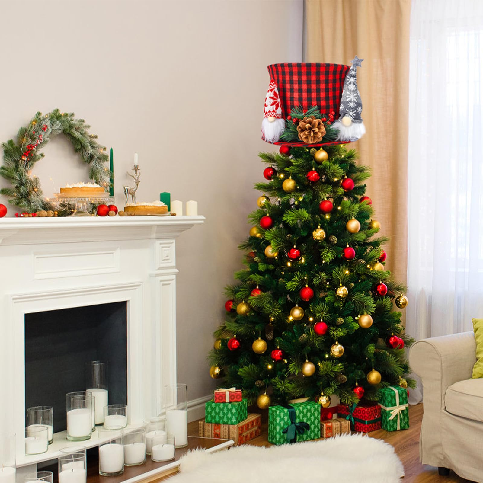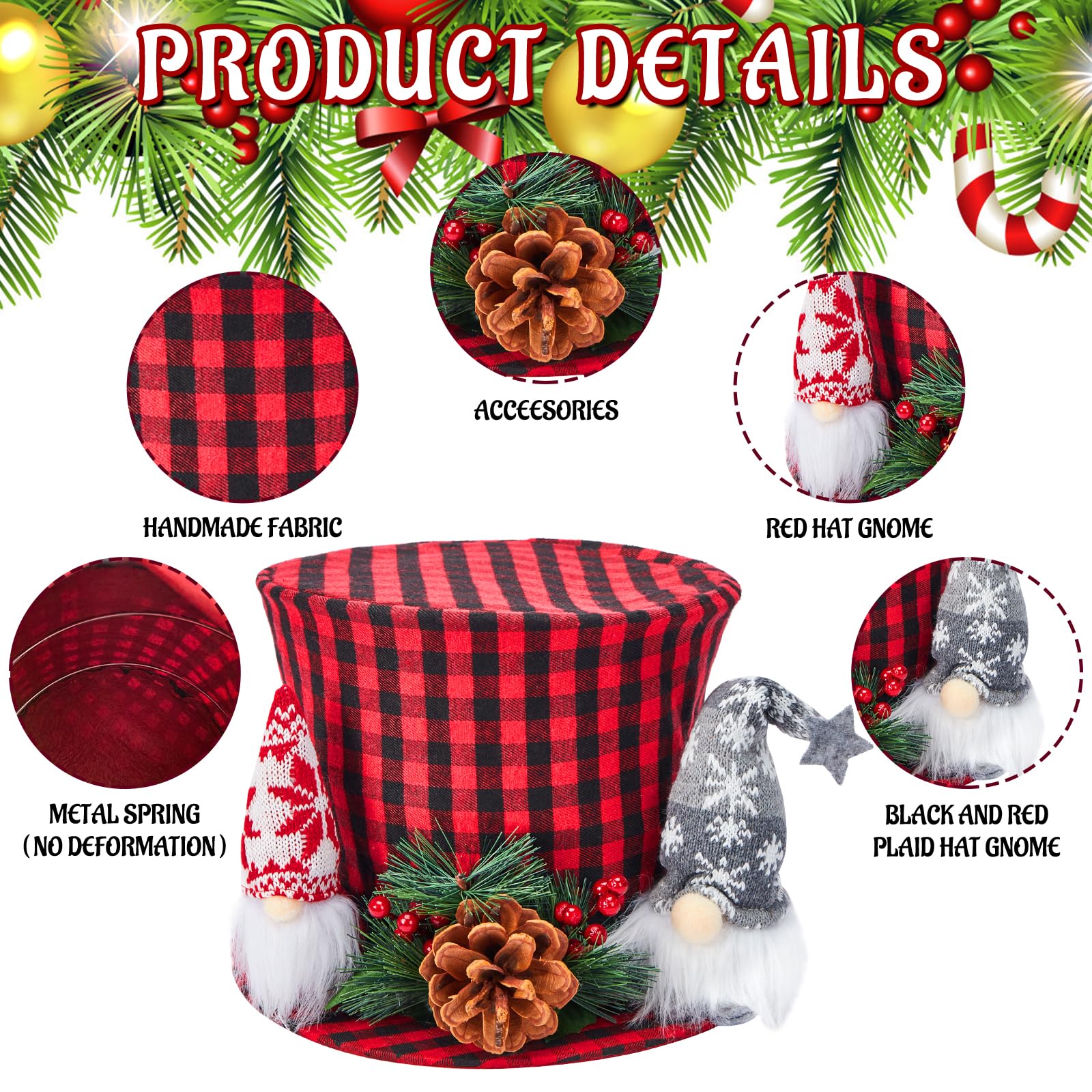 Christmas Tree Topper, Red and Black Buffalo Plaid Top Hat Christmas Tree Decorations Santa Gnome Ornaments Large Christmas Hat Tree Toppers Decor for X'Mas Home Party Supplies Festive Xmas Idea