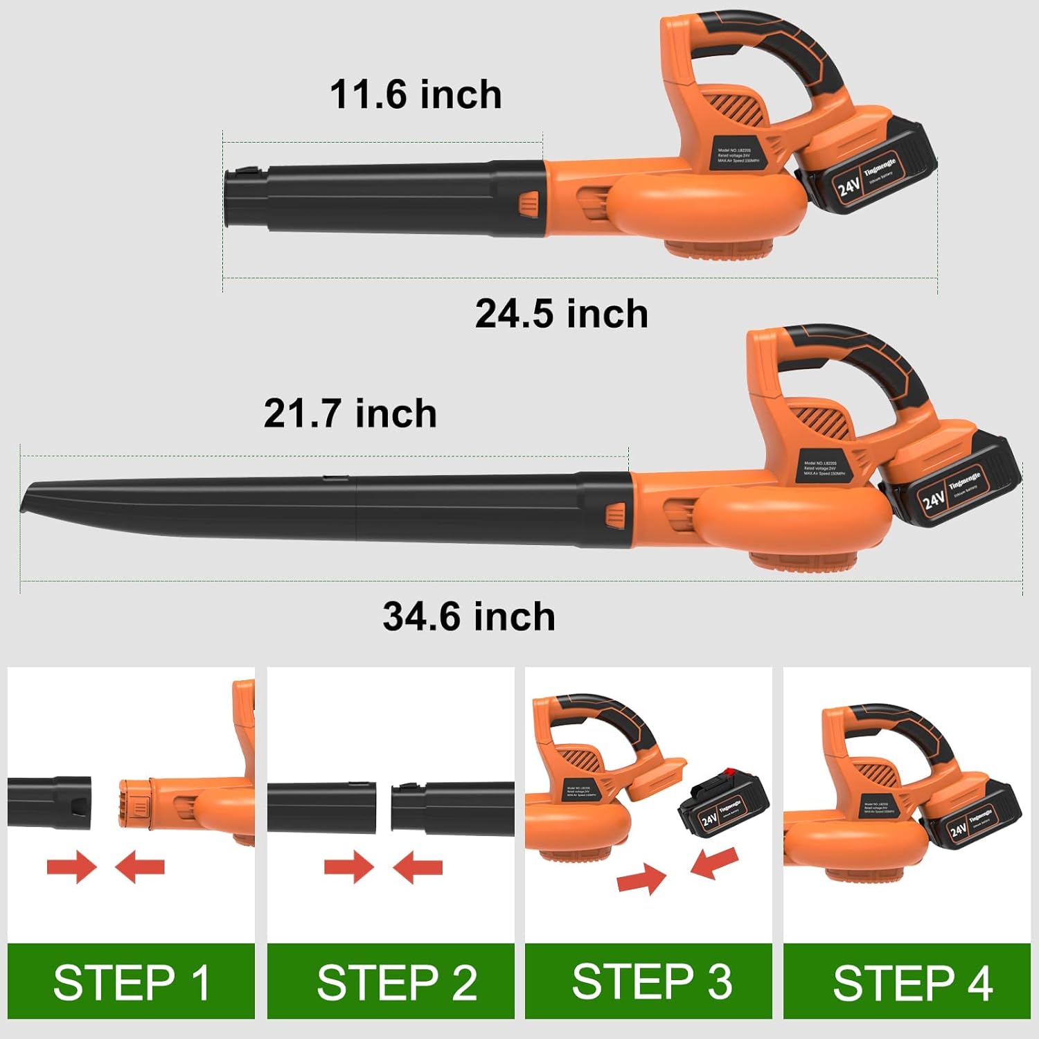 • 【SIMPLE TO ASSEMBLE & PACKAGE CONTENTS】The package includes 1×fast charger, 1×upper tube, 1×lower tube, 1×user manual and 2×24V battery. Equipped with adjustable blowing tubes, people of all heights can find a comfortable user experience with this blower. This Small cordless blower can be assembled within minutes which can be stored in a tiny place indoors or portable for outdoors.