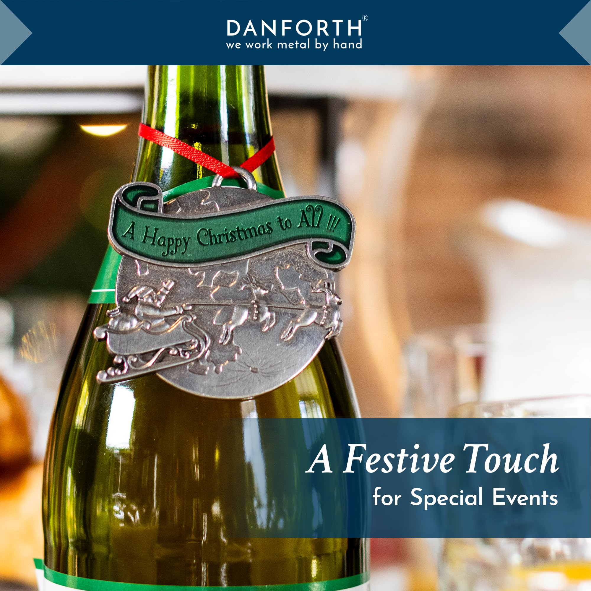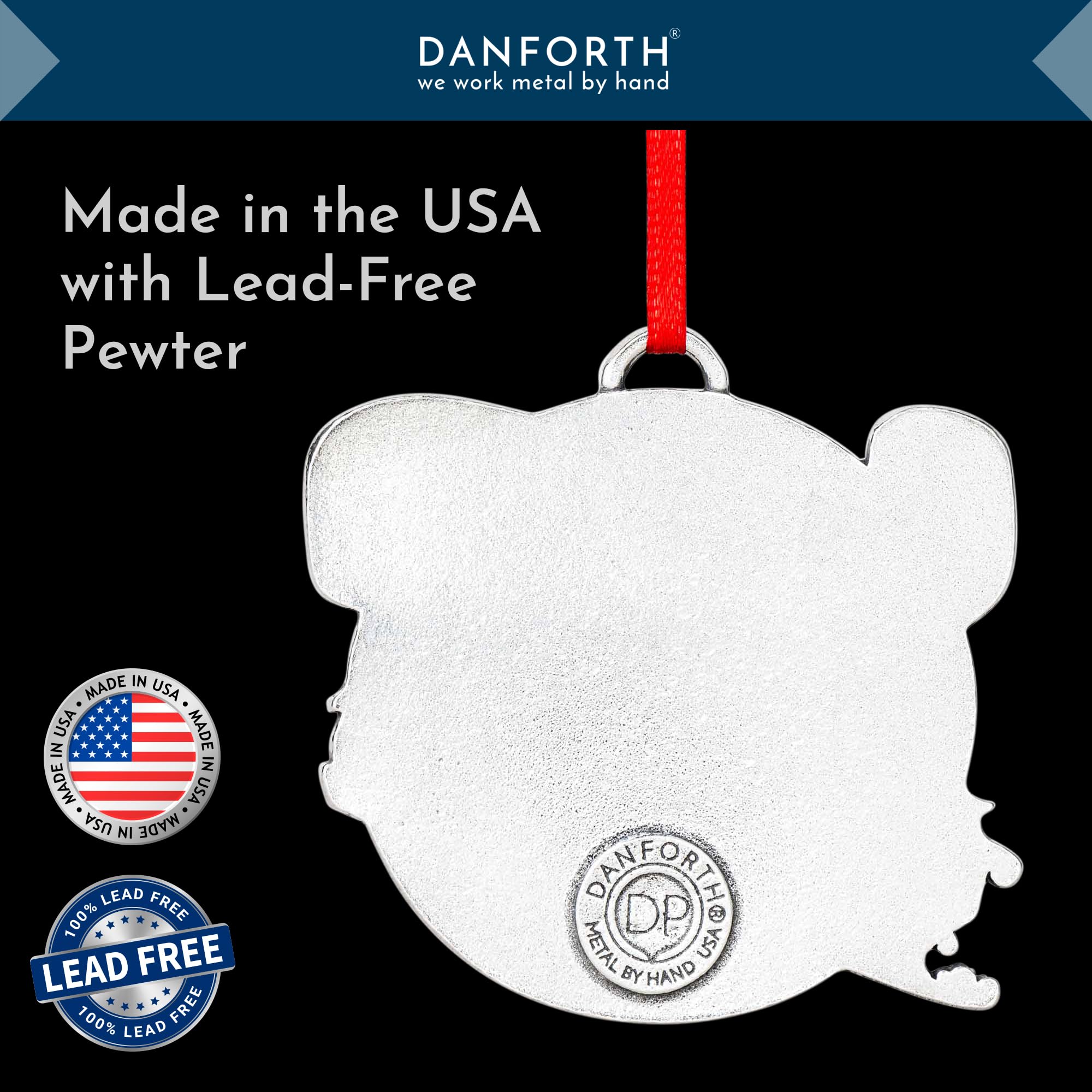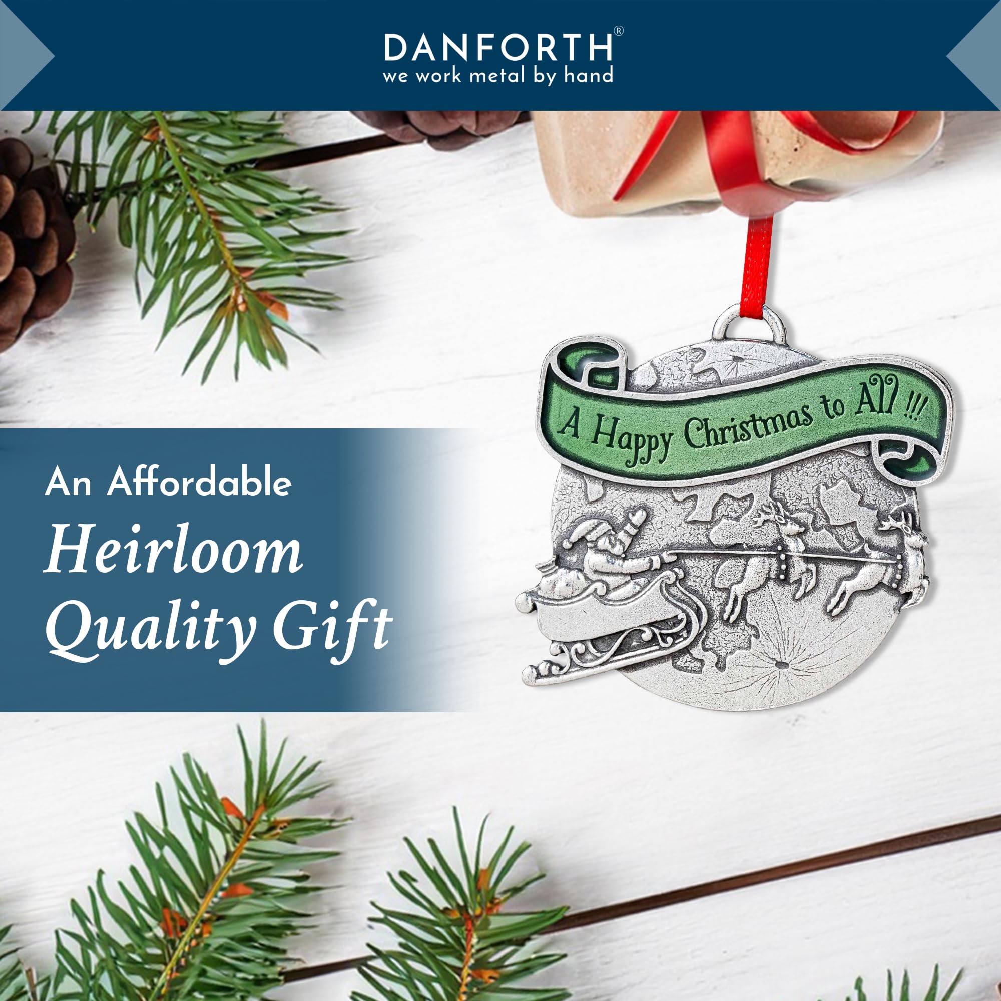DANFORTH - ‘A Happy Christmas’ Ornament Detailed Pewter with Green Sash, Hanging Christmas Tree Decoration, Santa’s Reindeer Collectors , Made in USA, Measures 2” Tall by 2 ¼” Wide