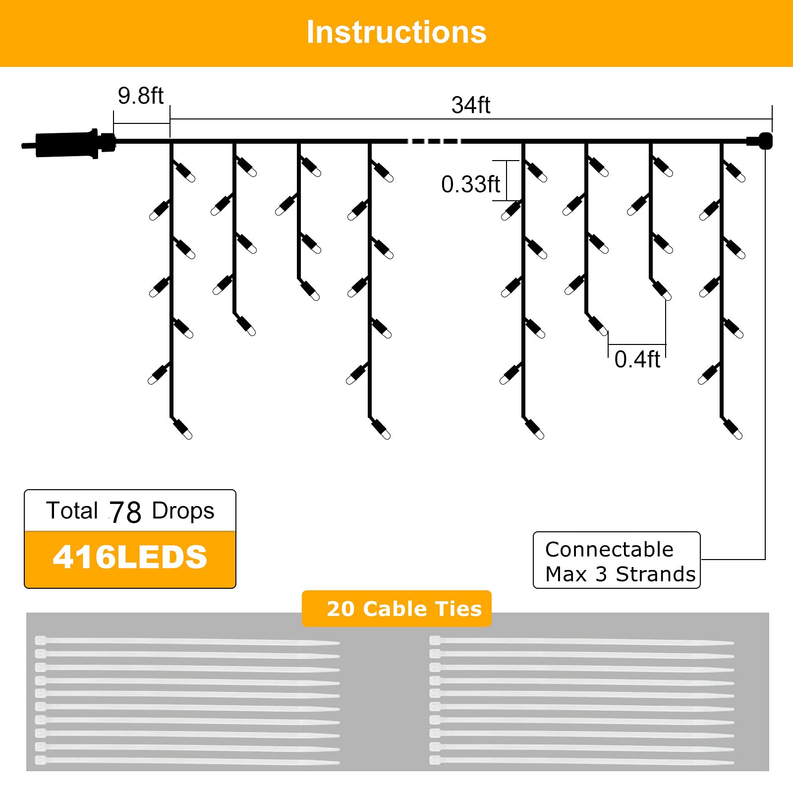 DDMY Christmas Lights Outdoor Decorations 416 LEDs 34 FT 8 Modes Curtain String Light with 78 Drops, Waterproof Clear Wire LED Light for Christmas Party Decor, House, Garden, Yard Decoration