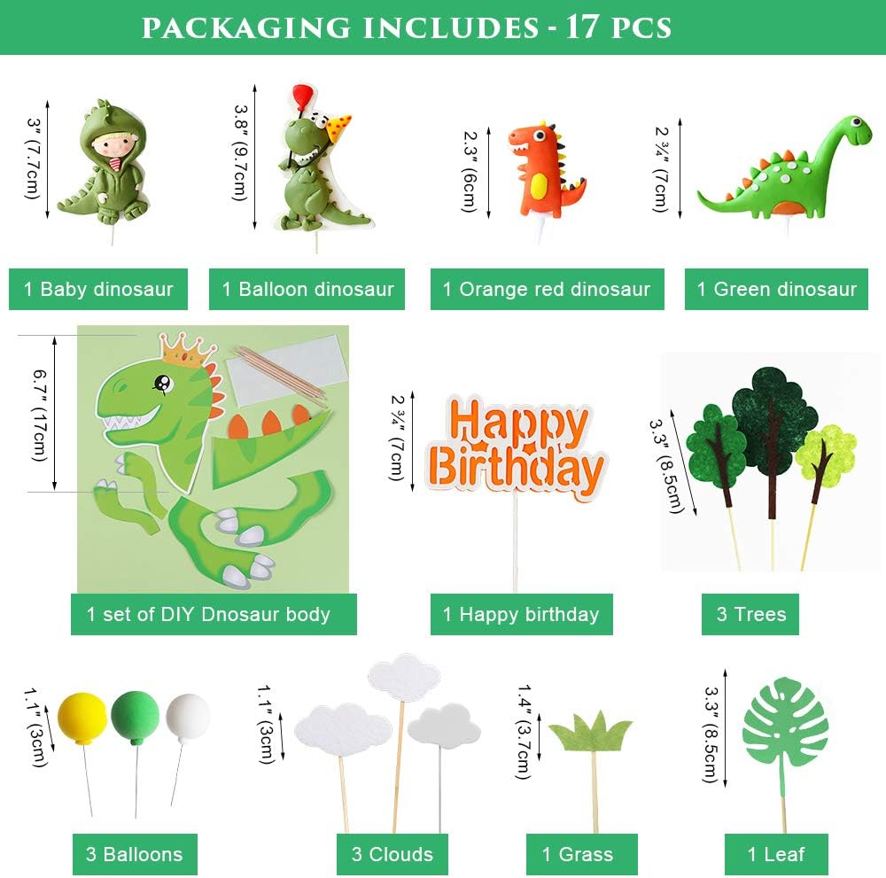 • ❉PACKAGE INCLUED: Set of 20 - 4 Dinosaurs, 1 set of DIY paper dinosaur, 1 happy birthday sign, 3 trees, 3 ballooms, 3 clouds, 1 sun, 3 grass and 1 leaf cake topper. Available 6" ,8" cake .