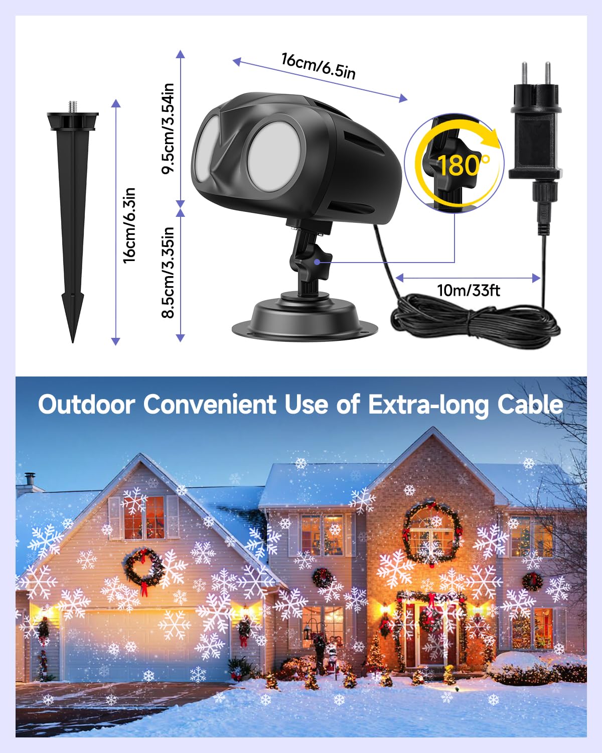 • 【Special Double Head】Innovative dual-head design, double the projection area, so that the light and shadow coverage is wider, whether in the spacious living room or outdoor projection of the house, you can easily create a spectacular and charming snow effect
