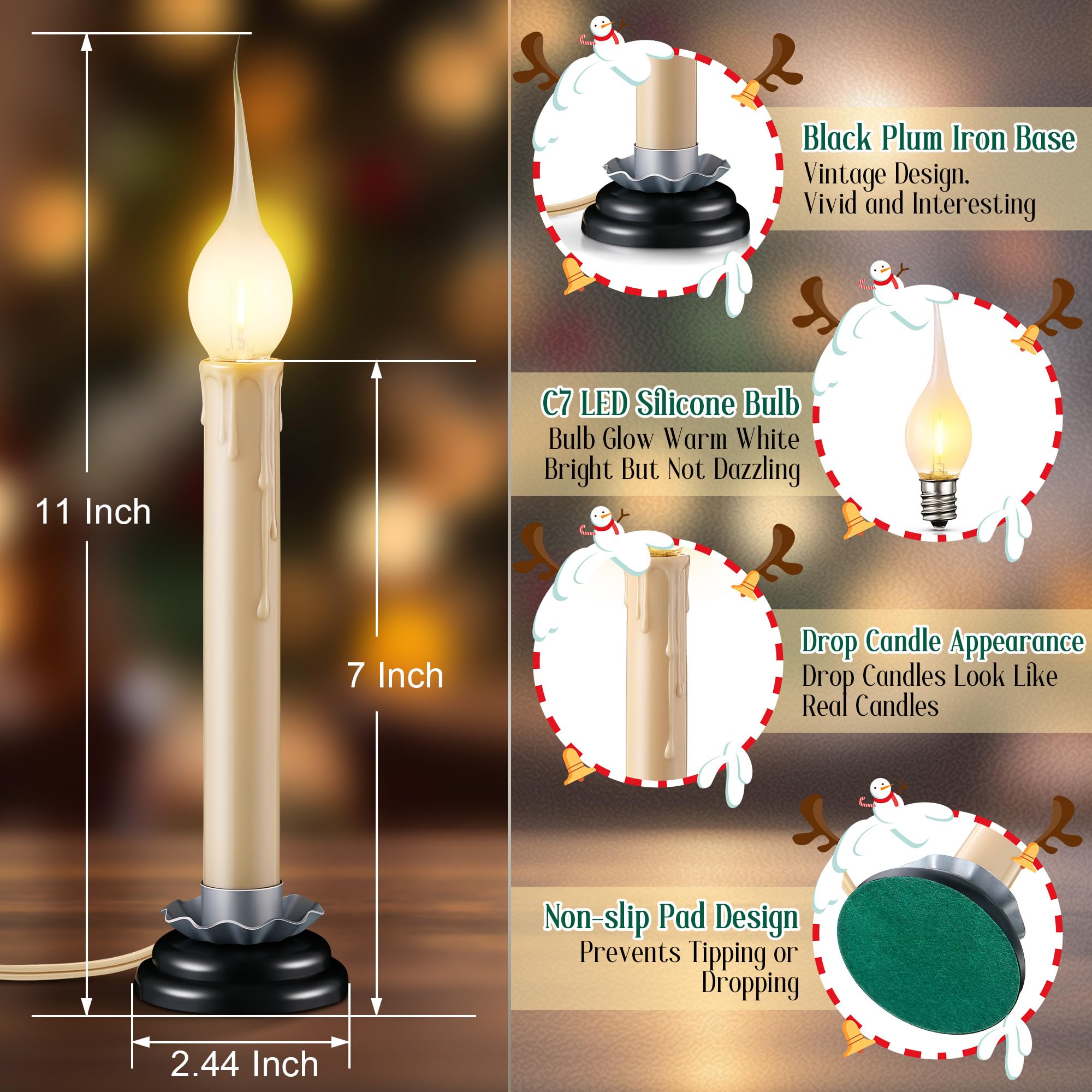 Rustic Vintage Design: Christmas electric window candle light with black plum iron base and dripping candle appearance, the dripping candles are like real candles LED silicone bulbs emit a warm light and are a top choice for holiday decorations and lighting for Christmas, windows, mantels, weddings, centerpieces, dining rooms, tables, parties, festivals, home decorations and lighting Safe and Reliable LED Silicone Bulb: Our electric window candles are d with an LED bulb design, 120V C7 0.6W, lifespan up to 1500 hours Electric candle lights has UL certification, featuring energy saving, smokeless, flameless LED lights, achieving zero carbon emissions, and are safe for children, pets, and the elderly