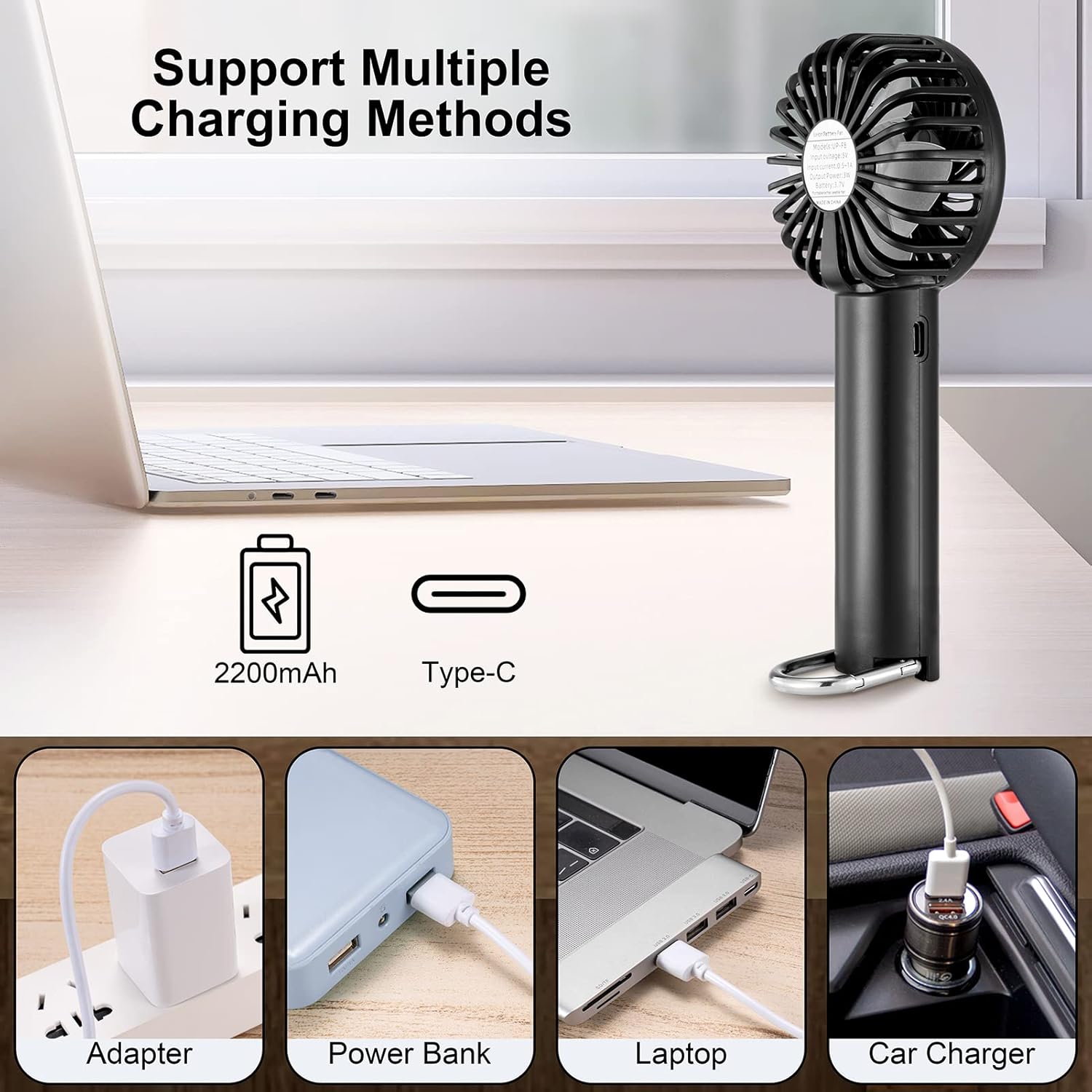 • Rechargeable Battery This mini fan is powered by a rechargeable battery,With a builtin durable battery,updated USBC portsupplied with USBC cable,compatible with all USB charging ports such as power banks, laptops,adapters and car chargers.