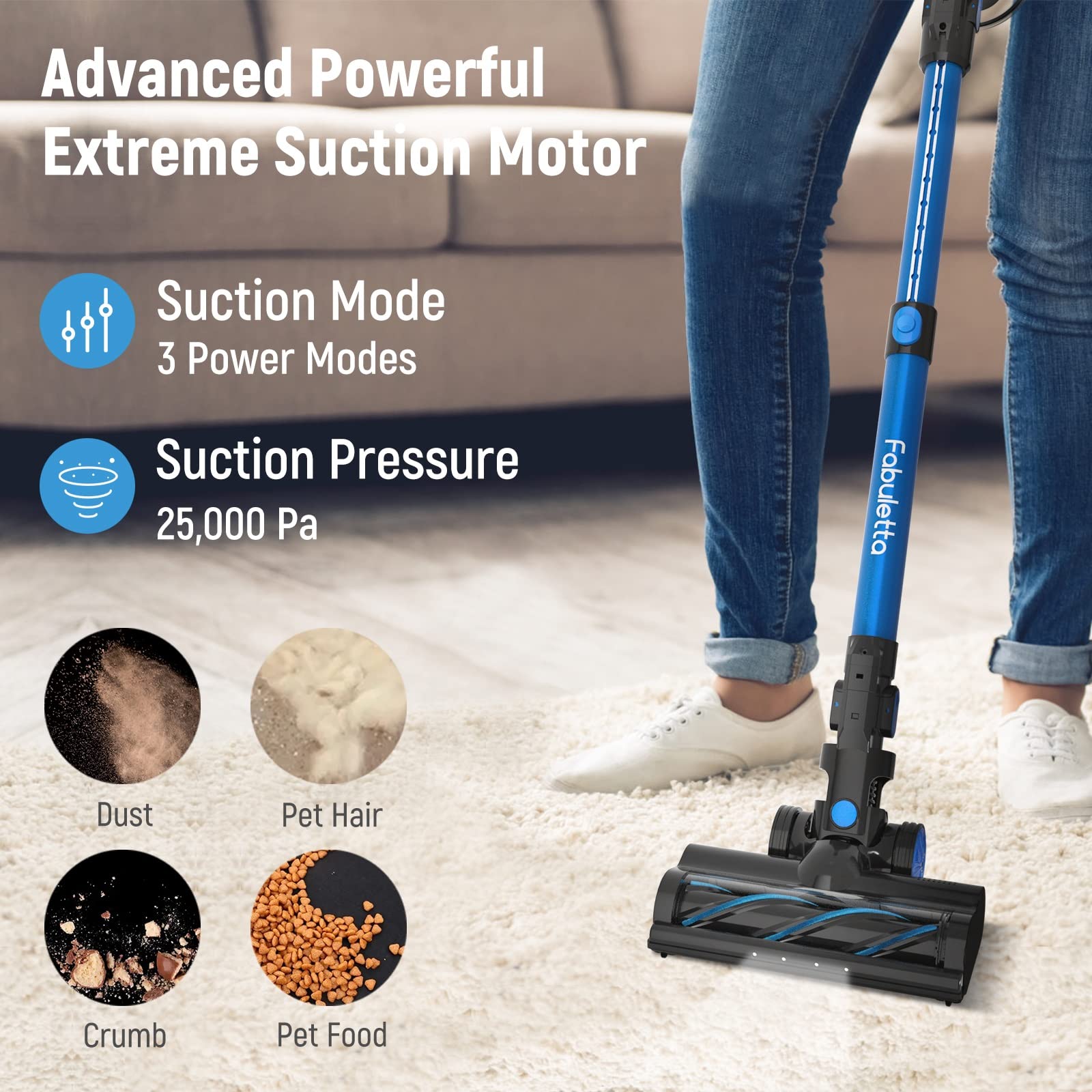 • Powerful Suction with d Brushless Motor The FABULETTA FSV003 cordless vacuum cleaner is equipped with a highperformance 250W Brushless Motor, delivering an impressive 25Kpa Strong Suction on MAX mode. Enjoy the convenience of three suction modes: Eco Mode 12Kpa, Standard Mode 18Kpa, and Max Mode 25Kpa, allowing you to choose the power level that suits your cleaning needs.