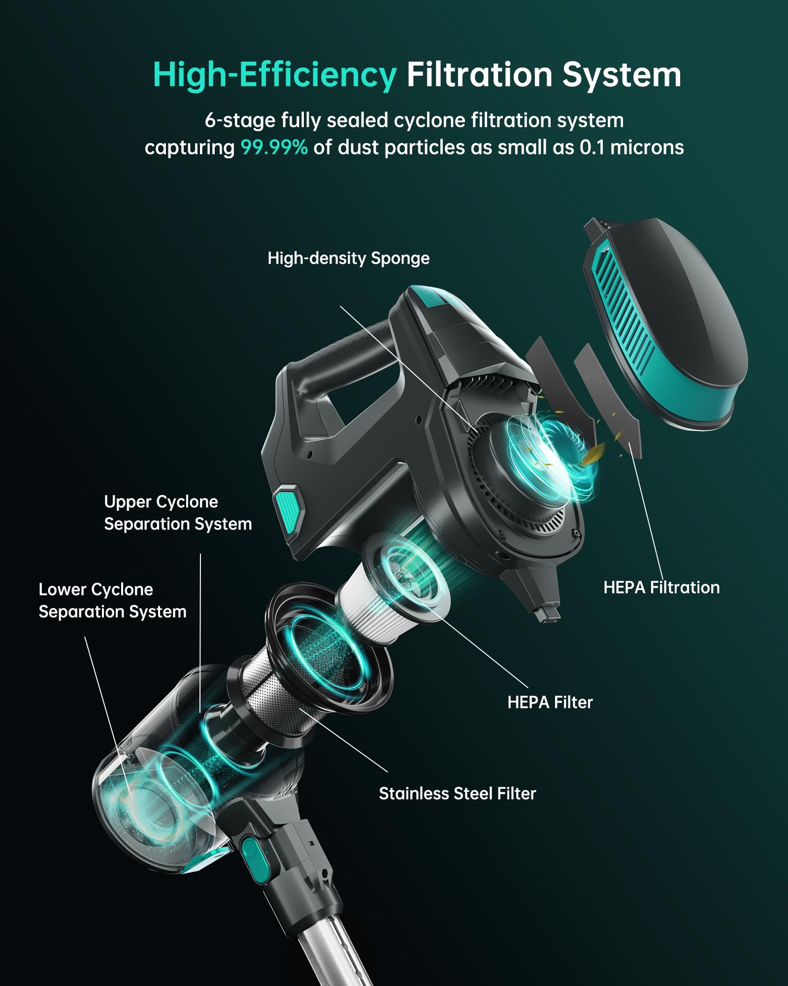 • Powerful Suction with d Brushless Motor The FABULETTA FSV003 cordless vacuum cleaner is equipped with a highperformance 380W Brushless Motor, delivering an impressive 30Kpa Strong Suction on MAX mode. Whether it's dust, dirt, or pet hair, this cordless vacuum cleaner ensures thorough cleaning on various surfaces, leaving your home spotless. Choose different suction modesMaxStandardEco according to different scenarios to reduce power consumption.