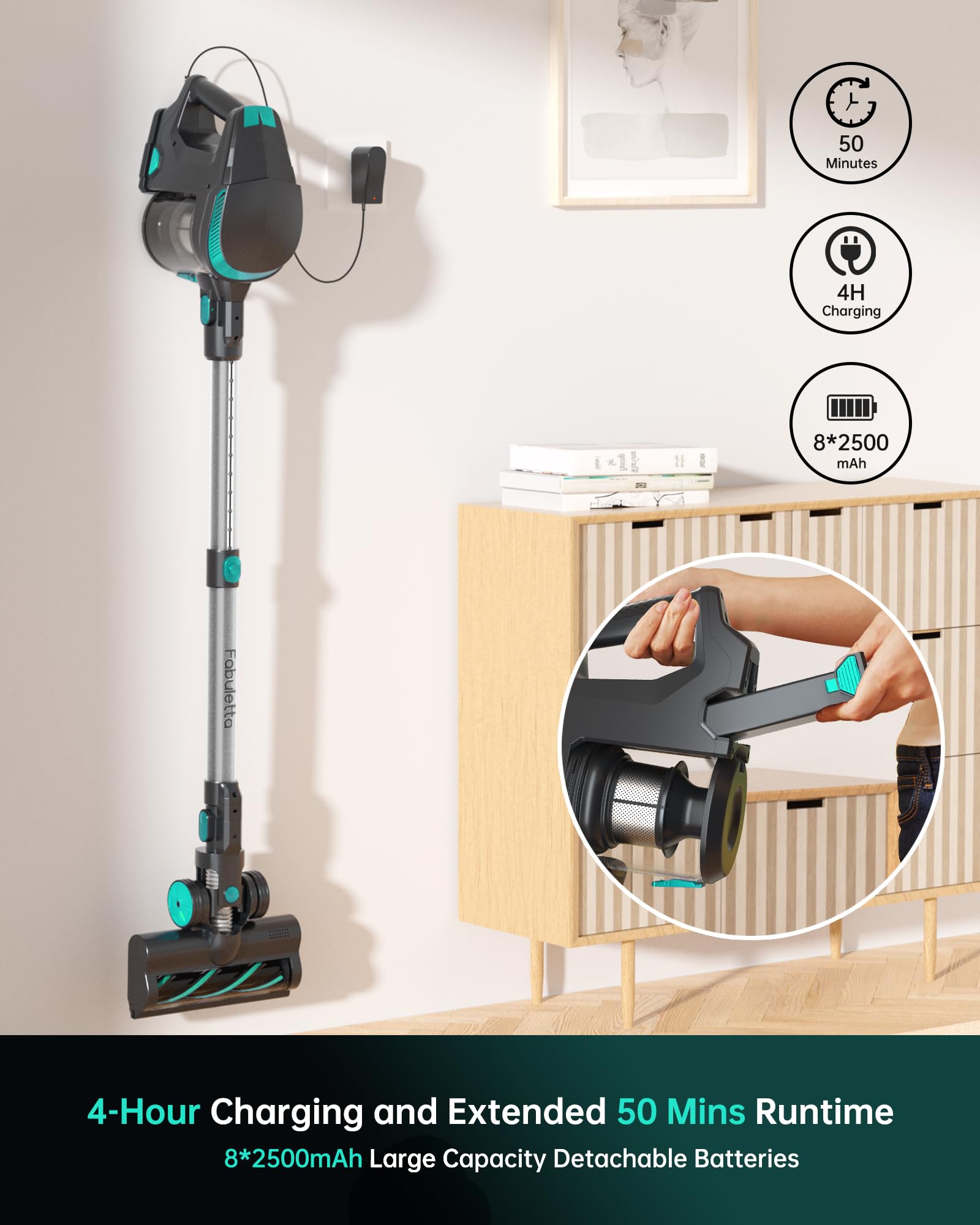 • Fast 4Hour Charging and 50Minute Runtime The FABULETTA rechargeable Cordless Stick Vacuum Cleaner features a detachable 8x2500mAh large capacity battery, providing max 50 minutes of cleaning in Eco Mode. For continuous cleaning sessions, you can purchase an additional battery separately to double the runtime, ensuring a comprehensive and uninterrupted wholehouse cleaning experience.