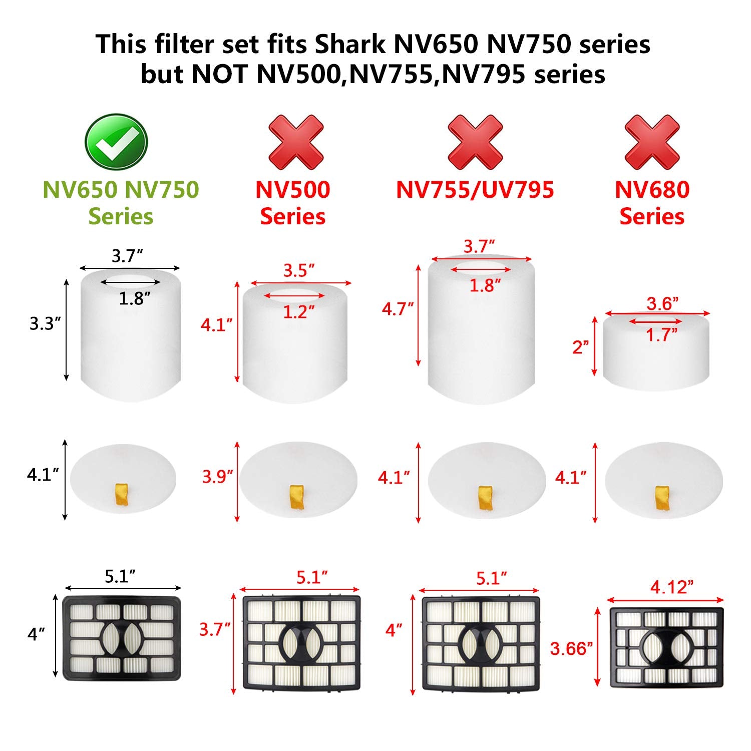 HEPA Filter for Shark NV650&750 Series Compatibility of the Shark Filter: NV650, NV650W, NV651, NV652, NV750W, NV751, NV752, AX950, AX951, AX952 Vacuums Replaces Part XFF650 & XHF650 NOT Compatible With: NV500, NV500W, NV500CO, NV501, NV502, NV503, NV505, NV510, NV520, NV550, NV552, UV560 or part XHF500 & XFF500. NV680, NV681, NV682, NV683, NV800, NV800W, NV801, NV803, UV810 or part XHF680 & XFF680. NV755, UV795, or part XFF755. The filter set fits Shark NV650 and NV750 series, but not NV500, NV755,NV795 or NV680 series. Washable & Reusable How To Clean Shark Filter Step 1: Remove the dust cup. Step 2: Rinse the shark foams thoroughly in water until the water runs clear. Step 3: Need to tap loose dirt off filters between washes,then squeeze out excess water. Step 4: Let air dry completely for at least 24 hours before replacing. How To Clean Shark Hepa Filters Step 1: Remove the shark filter. Step 2: Rinse under water. Spraying the filter with the water until it is completely clear and clean. Step 3: Let the shark filter to airdry completely for 24 hours. Step 4: Replace the dry shark Hepa filter into the vacuum , and swinging the door securely closed until it clicks into place. Package Includes: 1 x HEPA Filter2 x Foams2 x Felts Why choose our Shark filters We will always committed to providing the highest quality products to make your home cleaner.