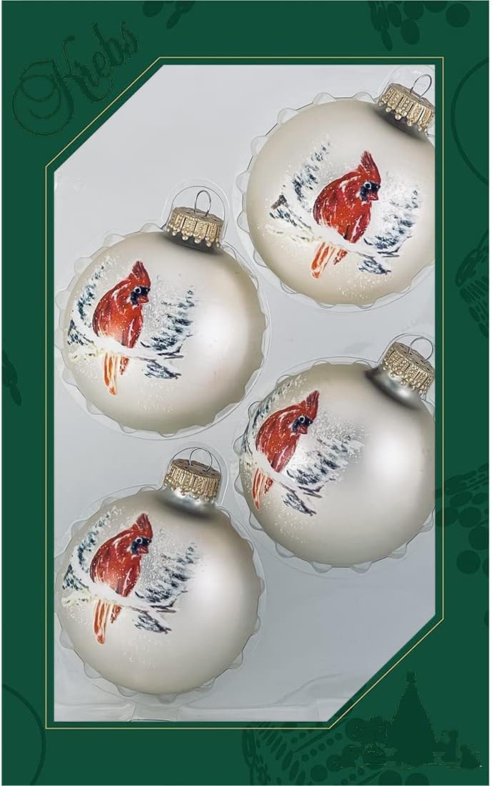 Glass Christmas Tree Ornaments - 67mm/2.625" [4 Pieces] Decorated Balls from Christmas by Krebs Seamless Hanging Holiday Decor (Velvet Oyster with Cardinal)