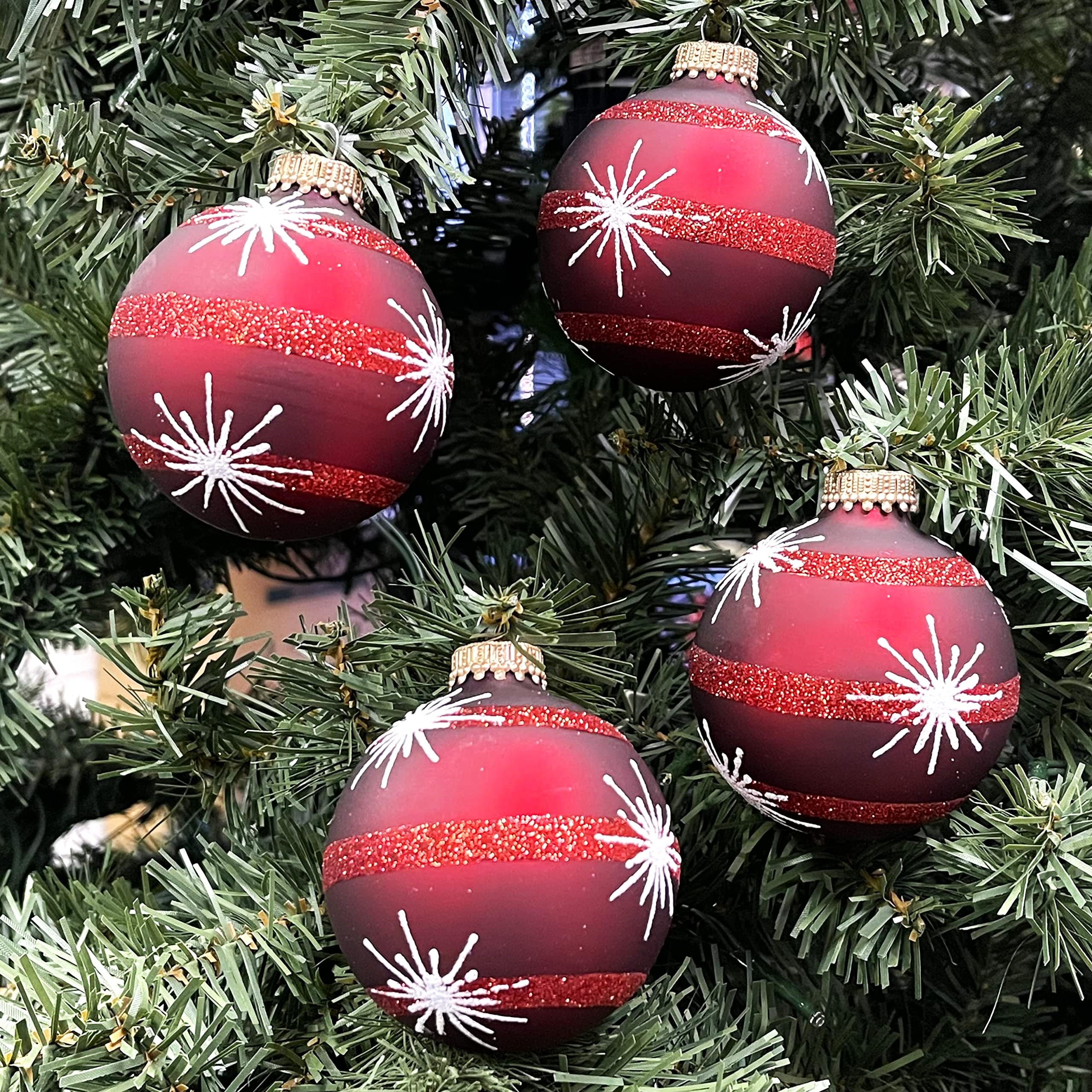 Glass Christmas Tree Ornaments - 67mm/2.63" [4 Pieces] Decorated Balls from Christmas by Krebs Seamless Hanging Holiday Decor (Red Velvet with Starbursts and Stripes)