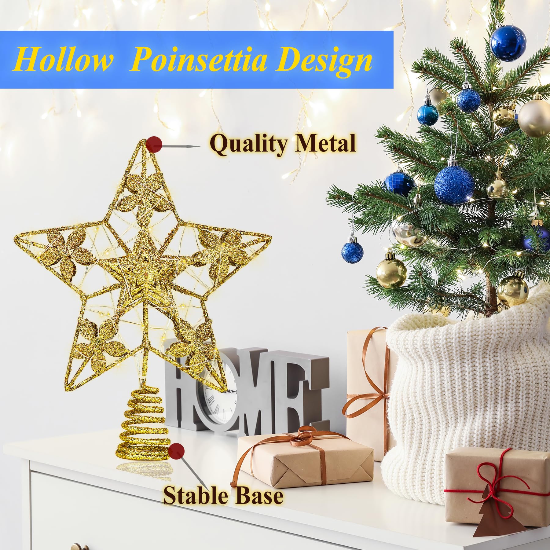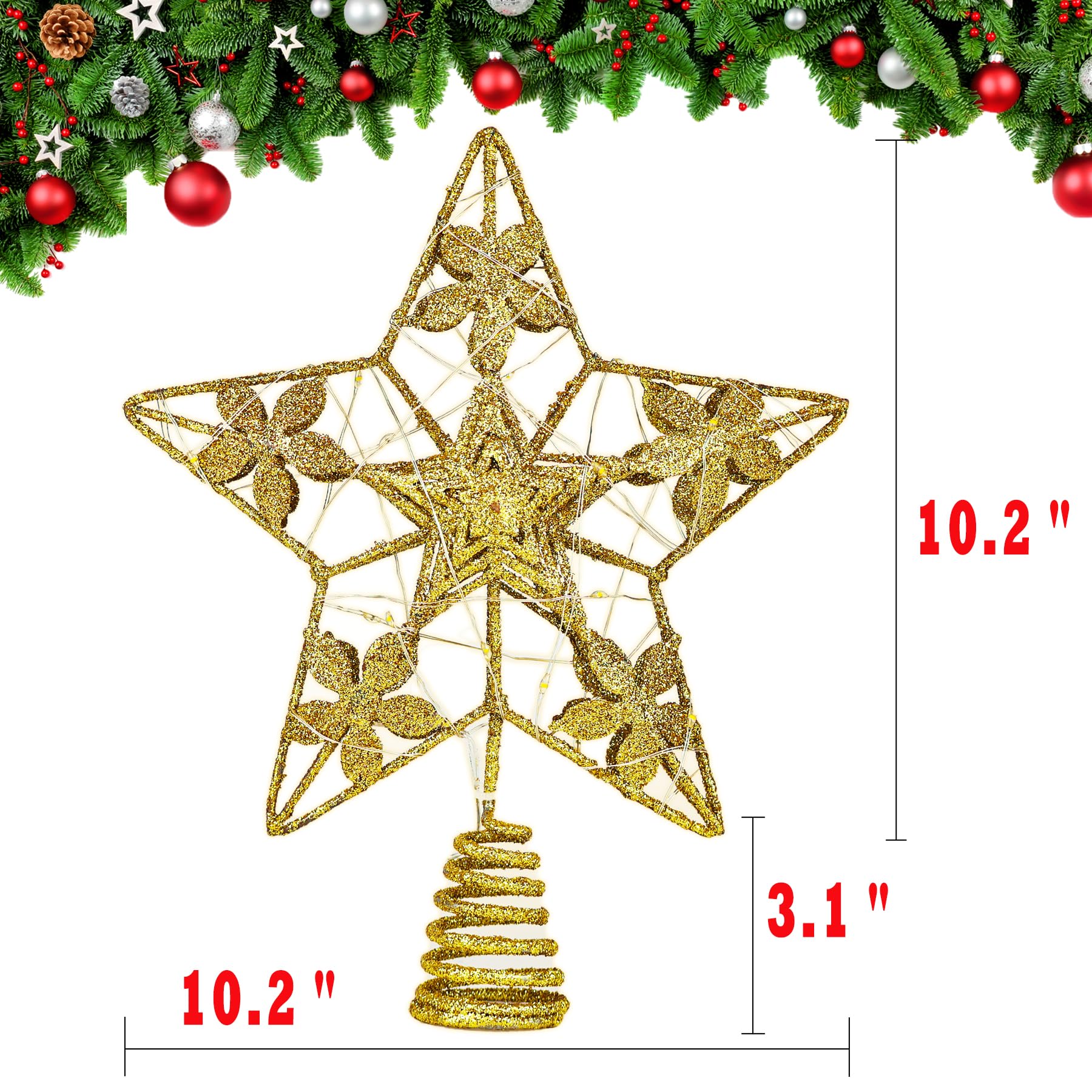 Glitter Gold Star Tree Topper, 3D Hollow Poinsettia Tree Toppers Christmas Decorations Battery Operated, Metal Christmas Tree Topper Star with Lights, Lighted Christmas Tree Star Topper