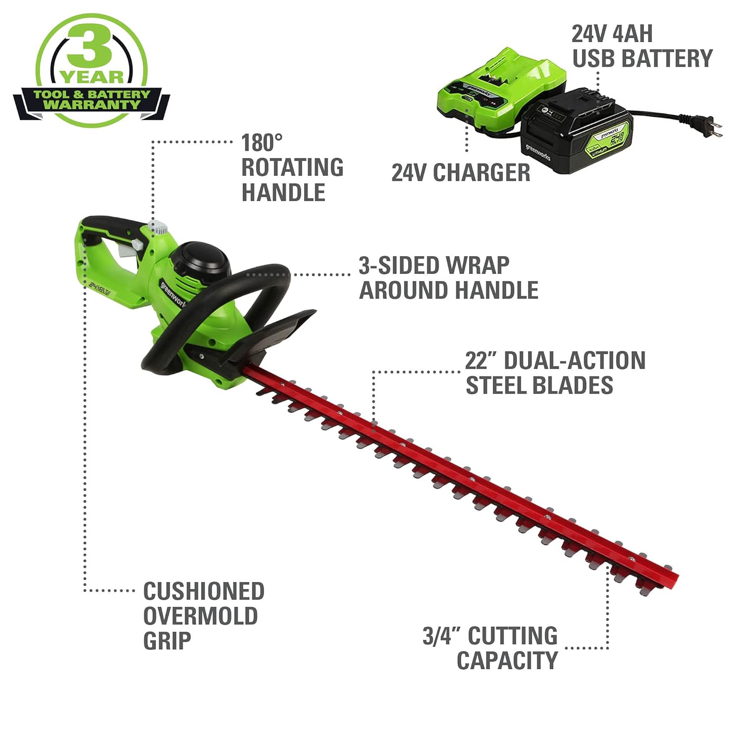 Greenworks 24V 22" Cordless Laser Cut Hedge Trimmer, 4.0Ah USB Battery and Charger Included