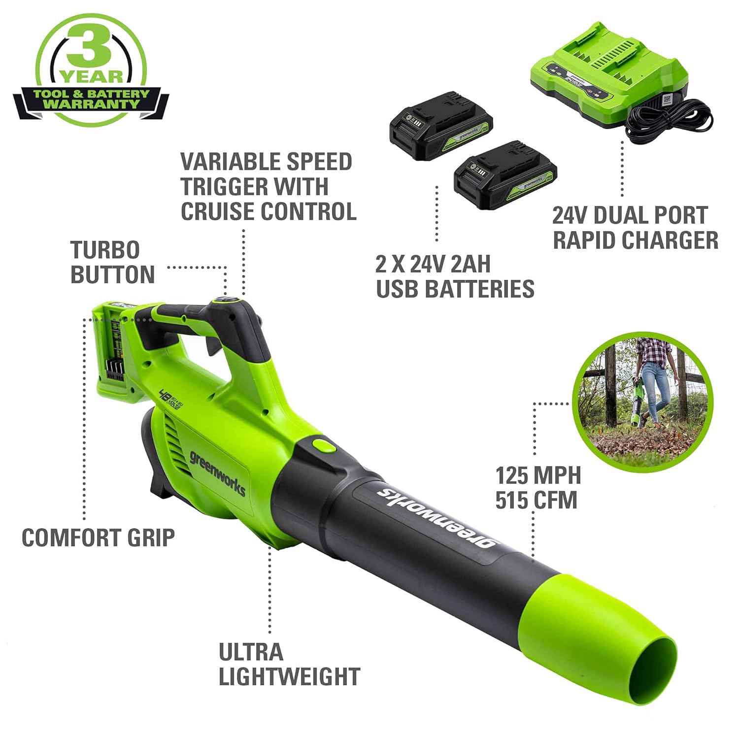 Greenworks 48V (2 x 24V) Cordless Axial Blower (515 CFM / 125 MPH), (2) 2.0Ah Batteries and Dual Port Charger with 24V Chainsaw