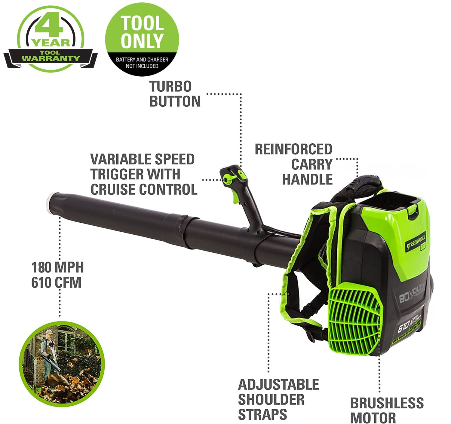 Greenworks Pro 80V (180 MPH / 610 CFM) Brushless Cordless Backpack Leaf Blower, Tool Only BPB80L00 & Greenworks PRO 80V Rapid Charger (Genuine Greenworks Charger)