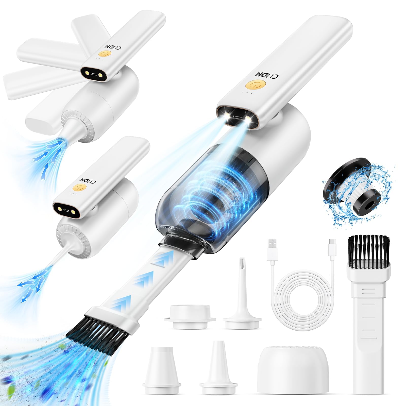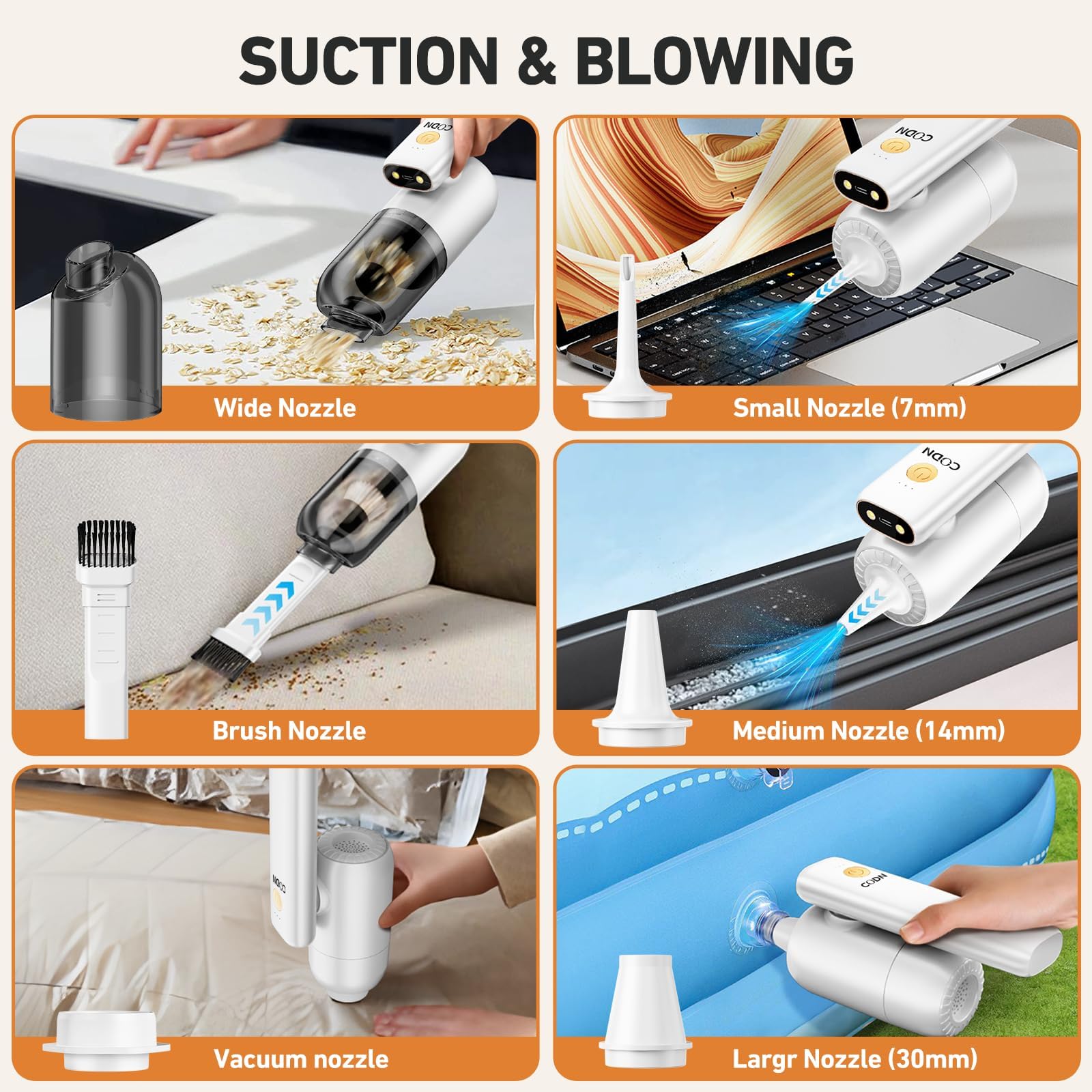 • ⚡ 【 4IN1 MULTIFUNCTIONAL CORDLESS VACUUM CLEANER 】 The mini vacuum cleaner is equipped with four functions: suction, blowing, inflation and vacuuming. Strong suction power to thoroughly clean every inch of space. Unique blowing design, to deal with different cleaning challenges. Smart inflatable, inflate swimming ring etc. Highly efficient air bleed nozzle, a simple solution to the problem of storage. The vacuum cleaner collector makes the dust in all places have nowhere to hide.