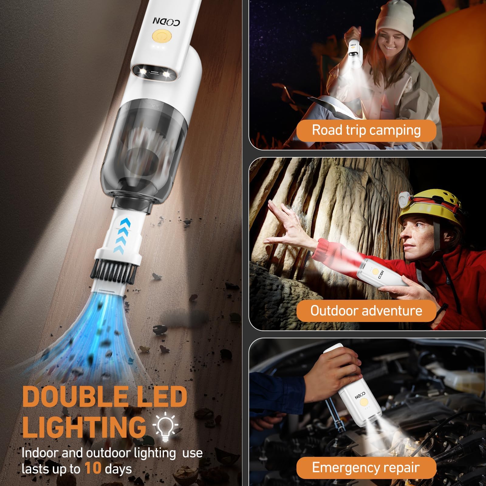 • 🌌【 SUPERIOR SUCTION & QUICK CHARGING 】 The vacuum cleaner can easily solve your cleaning challenges with its 120W high power motor and 15,000Pa suction power. In addition, the cordless vacuum cleaner has 22000mAh builtin battery and typeC fast charging port, allowing you to charge easily using your car, laptop, etc. The reusable car vacuum cleaner is environmentally friendly and energy efficient, saving money and time, and is a complete alternative to compressed air canisters.